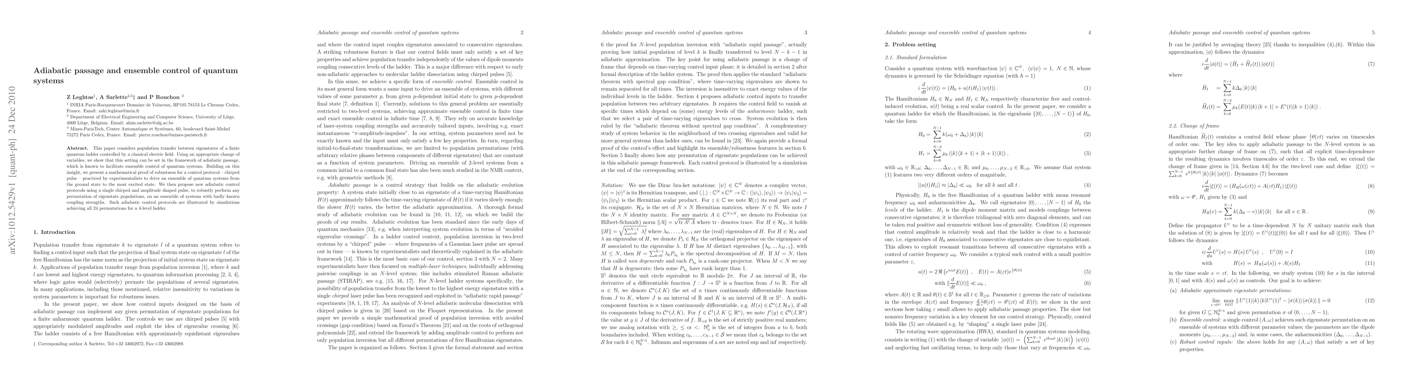 This paper explores population transfer between quantum ladder eigenstates using adiabatic passage, demonstrating robustness of chirped pulse control protocols. It proposes new adiabatic control methods for ensemble manipulation, illustrated by simulations achieving all 24 permutations for a 4-level system.