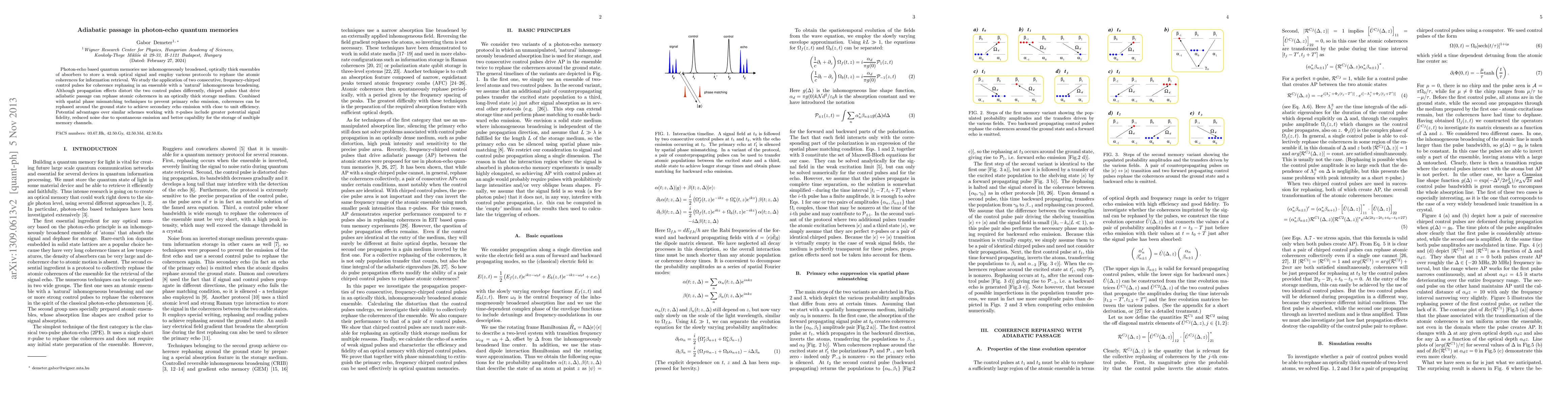 This paper investigates the use of frequency-chirped control pulses for coherence rephasing in photon-echo quantum memories, achieving secondary echo emission with near-unit efficiency. The proposed adiabatic passage method offers advantages over $\pi$-pulse schemes, including higher signal fidelity, reduced noise, and better multi-channel storage capabilities.