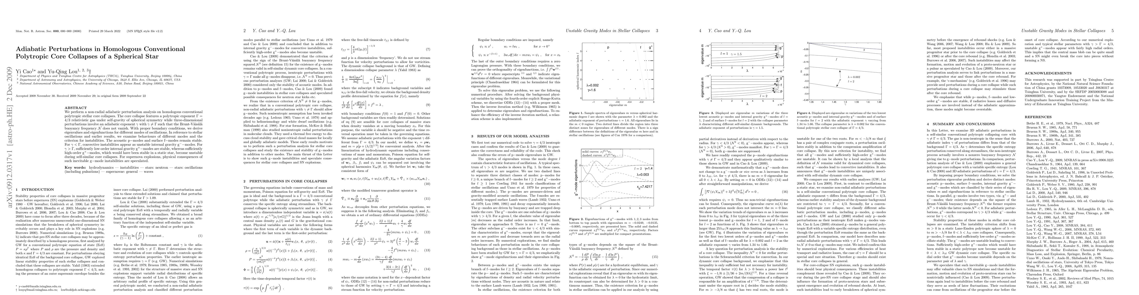 Researchers studied adiabatic perturbations in homologous conventional polytropic core collapses of spherical stars, finding that certain modes of oscillation can become unstable during collapse, potentially leading to physical consequences like supernova explosions.