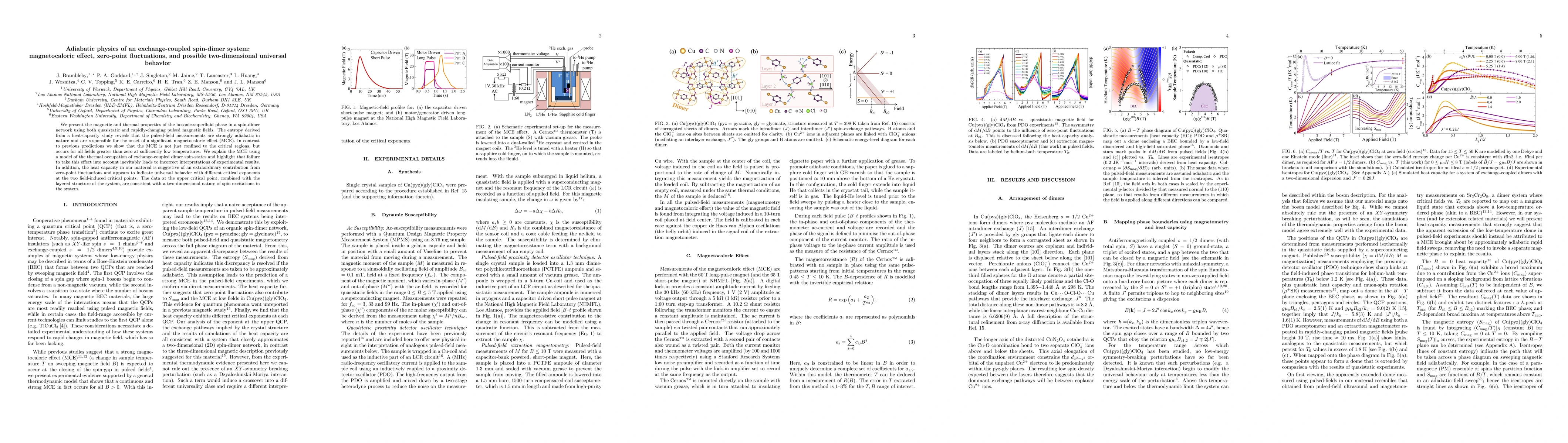 We present the magnetic and thermal properties of the bosonic-superfluid phase in a spin-dimer network using both quasistatic and rapidly-changing pulsed magnetic fields. The entropy derived from a heat-capacity study reveals that the pulsed-field measurements are strongly adiabatic in nature and are responsible for the onset of a significant magnetocaloric effect (MCE). In contrast to previous predictions we show that the MCE is not just confined to the critical regions, but occurs for all fields greater than zero at sufficiently low temperatures. We explain the MCE using a model of the thermal occupation of exchange-coupled dimer spin-states and highlight that failure to take this effect into account inevitably leads to incorrect interpretations of experimental results. In addition, the heat capacity in our material is suggestive of an extraordinary contribution from zero-point fluctuations and appears to indicate universal behavior with different critical exponents at the two field-induced critical points. The data are consistent with a two-dimensional nature of spin excitations in the system.