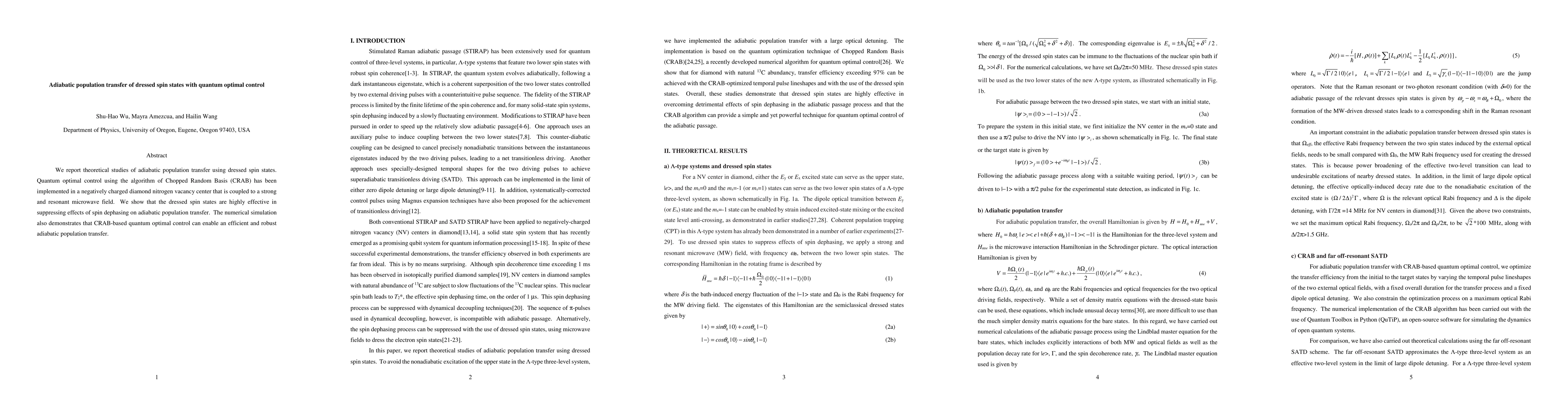 This paper presents theoretical studies on adiabatic population transfer using dressed spin states in a nitrogen vacancy center in diamond, employing quantum optimal control via the Chopped Random Basis algorithm. The study shows that dressed spin states effectively suppress spin dephasing, and CRAB-based control enables efficient and robust adiabatic population transfer.