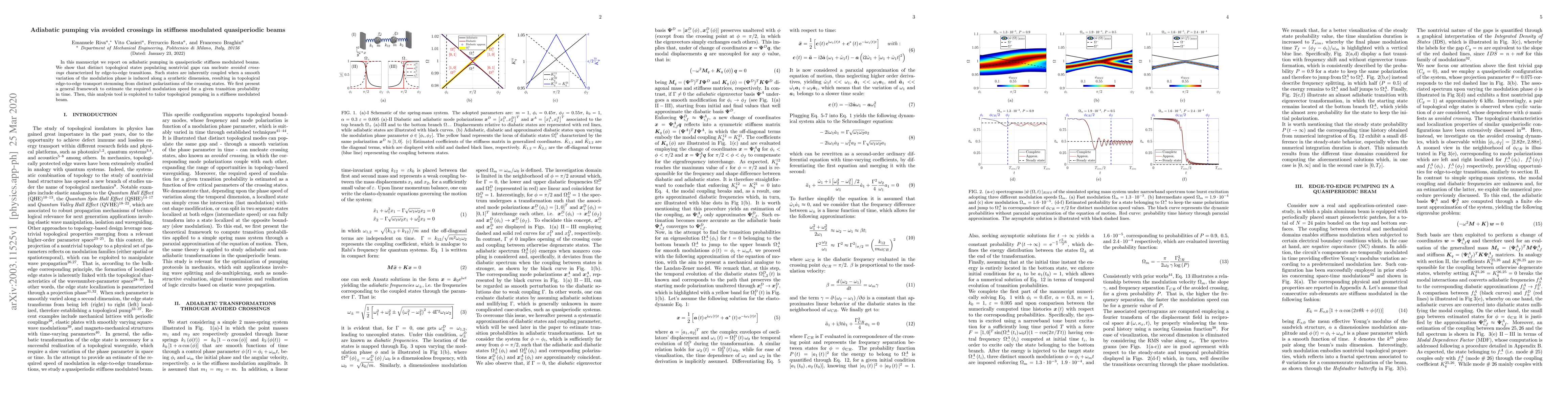 This paper investigates adiabatic pumping in quasiperiodic stiffness modulated beams, demonstrating how topological states can induce avoided crossings leading to edge-to-edge transitions. A framework is developed to estimate the modulation speed for desired transition probabilities, enabling the control of topological pumping in these beams.