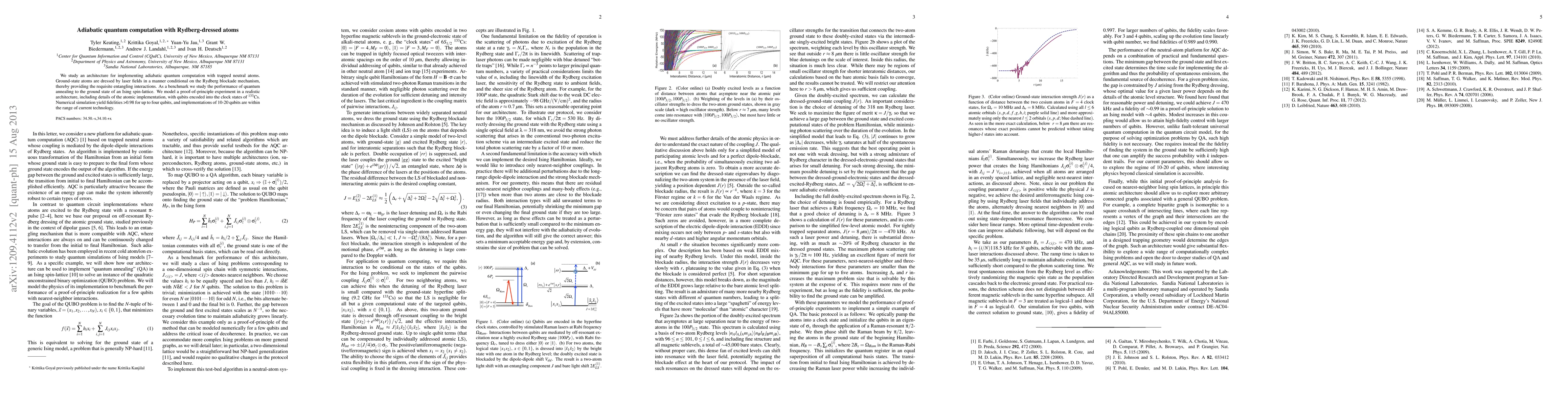 This paper explores adiabatic quantum computation using Rydberg-dressed neutral atoms, leveraging the Rydberg blockade for entangling interactions. It demonstrates the solution of a QUBO problem through an Ising-like model, achieving a two-qubit fidelity of around 0.99, with potential for higher fidelity with better laser technology.