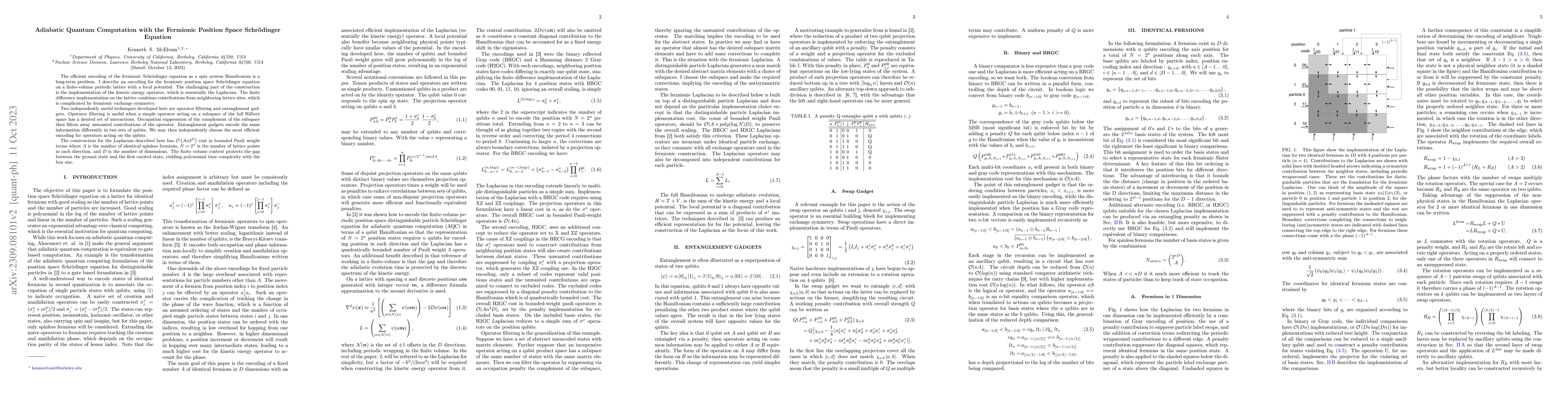 This paper presents an efficient encoding of the fermionic position space Schrödinger equation as a spin system Hamiltonian, focusing on the implementation of the kinetic energy operator (Laplacian) on a finite-volume periodic lattice. It introduces operator filtering and entanglement gadgets to manage the complexity, achieving a polynomial time complexity in the box size.