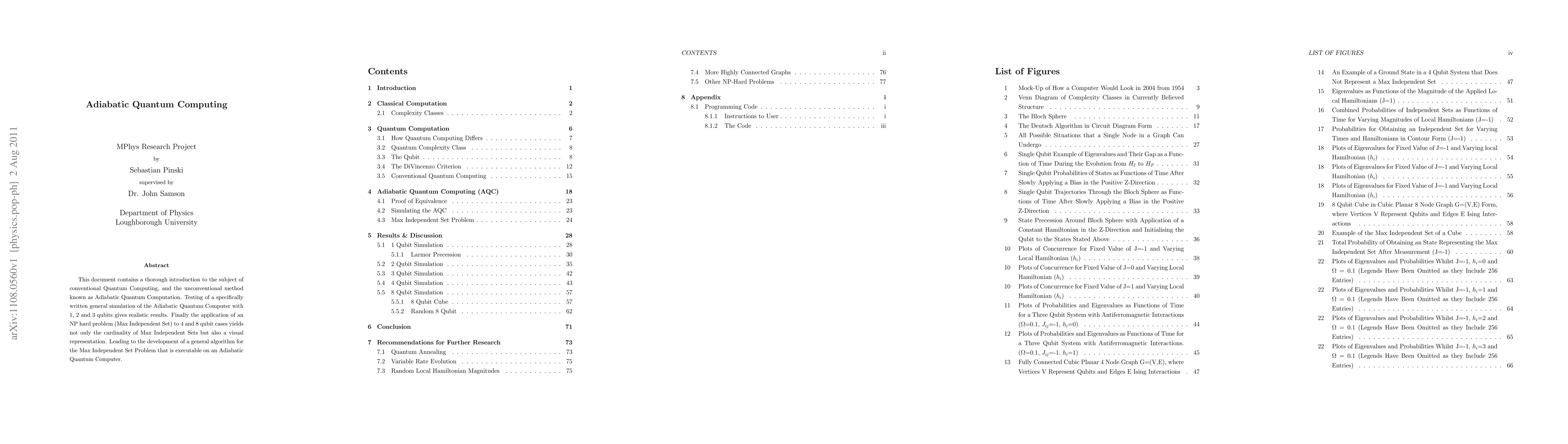 Adiabatic Quantum Computing (AQC) is a relatively new subject in the world of quantum computing, let alone Physics. Inspiration for this project has come from recent controversy around D-Wave Systems in British Columbia, Canada, who claim to have built a working AQC which is now commercially available and hope to be distributing a 1024 qubit chip by the end of 2008. Their 16 qubit chip was demonstrated online for the Supercomputing 2007 conference within which a few small problems were solved; although the explanations that journalists and critics received were minimal and very little was divulged in the question and answer session. This 'unconvincing' demonstration has caused physicists and computer scientists to hit back at D-Wave. The aim of this project is to give an introduction to the historic advances in classical and quantum computing and to explore the methods of AQC. Through numerical simulations an algorithm for the Max Independent Set problem is empirically obtained.