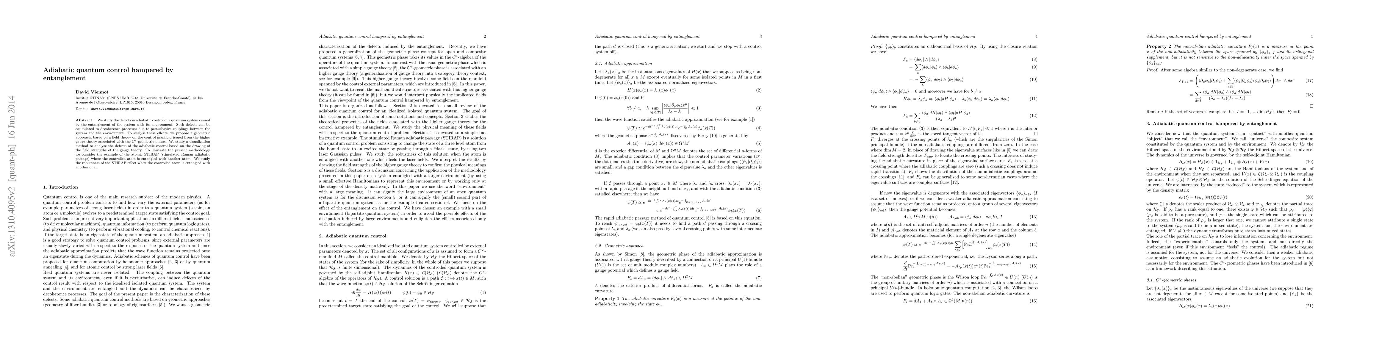 This paper investigates how entanglement between a quantum system and its environment disrupts adiabatic quantum control, comparing these defects to decoherence processes. It proposes a geometric approach based on higher gauge theory to analyze these effects and visualizes them using field strengths from the control manifold. The study applies this methodology to the STIRAP process, examining the robustness of the effect when the controlled atom is entangled with another.
