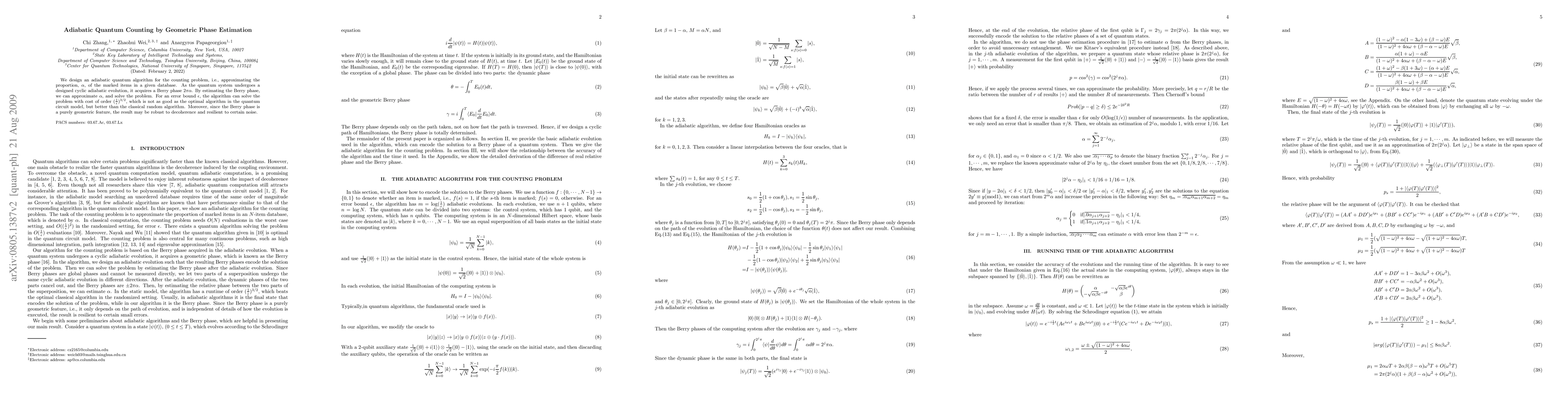 We design an adiabatic quantum algorithm for the counting problem, i.e., approximating the proportion, $\alpha$, of the marked items in a given database. As the quantum system undergoes a designed cyclic adiabatic evolution, it acquires a Berry phase $2\pi\alpha$. By estimating the Berry phase, we can approximate $\alpha$, and solve the problem. For an error bound $\epsilon$, the algorithm can solve the problem with cost of order $(\frac{1}{\epsilon})^{3/2}$, which is not as good as the optimal algorithm in the quantum circuit model, but better than the classical random algorithm. Moreover, since the Berry phase is a purely geometric feature, the result may be robust to decoherence and resilient to certain noise.