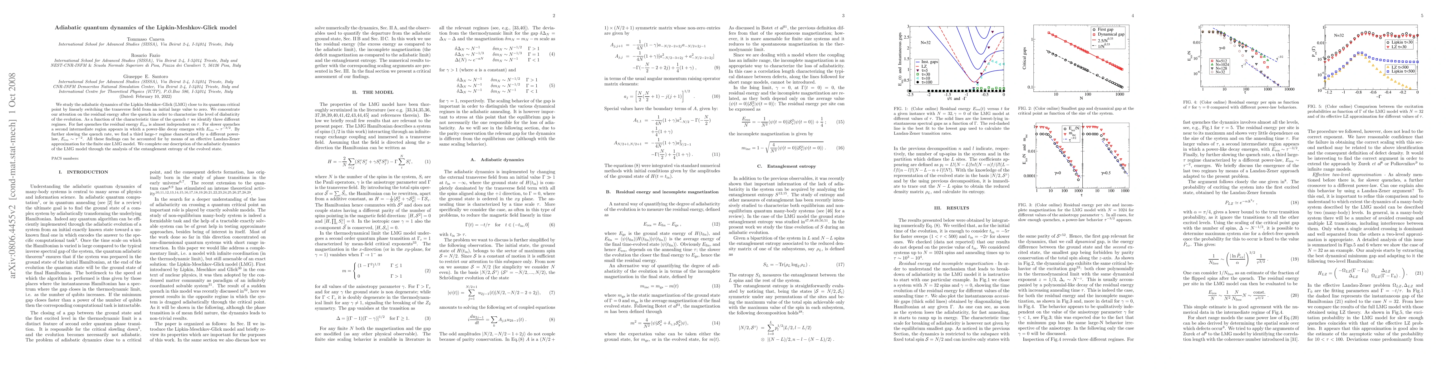 The adiabatic quantum evolution of the Lipkin-Meshkov-Glick (LMG) model across its quantum critical point is studied. The dynamics is realized by linearly switching the transverse field from an initial large value towards zero and considering different transition rates. We concentrate our attention on the residual energy after the quench in order to estimate the level of diabaticity of the evolution. We discuss a Landau-Zener approximation of the finite size LMG model, that is successful in reproducing the behavior of the residual energy as function of the transition rate in the most part of the regimes considered. We also support our description through the analysis of the entanglement entropy of the evolved state. The system proposed is a paradigm of infinite-range interaction or high-dimensional models.
