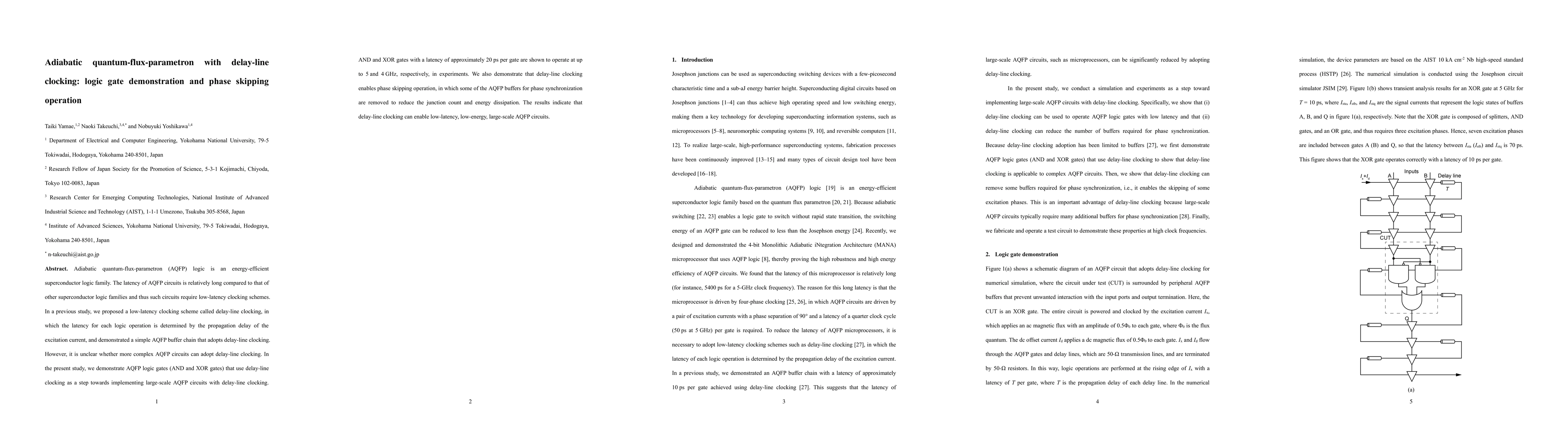 This paper demonstrates AQFP logic gates using delay-line clocking, achieving latencies of around 20 ps per gate and frequencies up to 5 GHz for AND gates and 4 GHz for XOR gates. It also shows phase skipping operation, reducing junction count and energy dissipation.