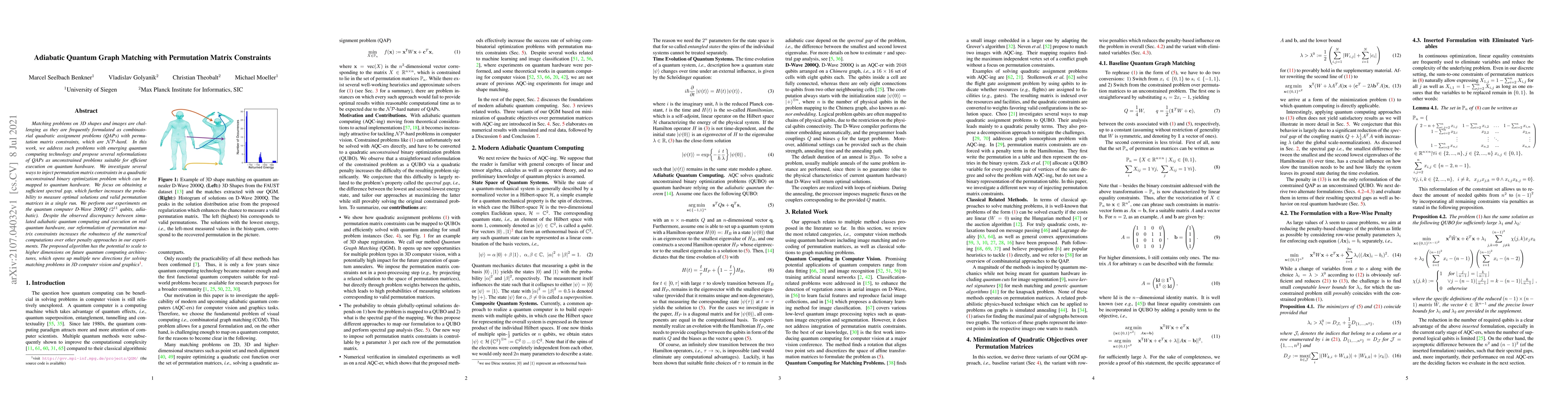 Matching problems on 3D shapes and images are challenging as they are frequently formulated as combinatorial quadratic assignment problems (QAPs) with permutation matrix constraints, which are NP-hard. In this work, we address such problems with emerging quantum computing technology and propose several reformulations of QAPs as unconstrained problems suitable for efficient execution on quantum hardware. We investigate several ways to inject permutation matrix constraints in a quadratic unconstrained binary optimization problem which can be mapped to quantum hardware. We focus on obtaining a sufficient spectral gap, which further increases the probability to measure optimal solutions and valid permutation matrices in a single run. We perform our experiments on the quantum computer D-Wave 2000Q (2^11 qubits, adiabatic). Despite the observed discrepancy between simulated adiabatic quantum computing and execution on real quantum hardware, our reformulation of permutation matrix constraints increases the robustness of the numerical computations over other penalty approaches in our experiments. The proposed algorithm has the potential to scale to higher dimensions on future quantum computing architectures, which opens up multiple new directions for solving matching problems in 3D computer vision and graphics.