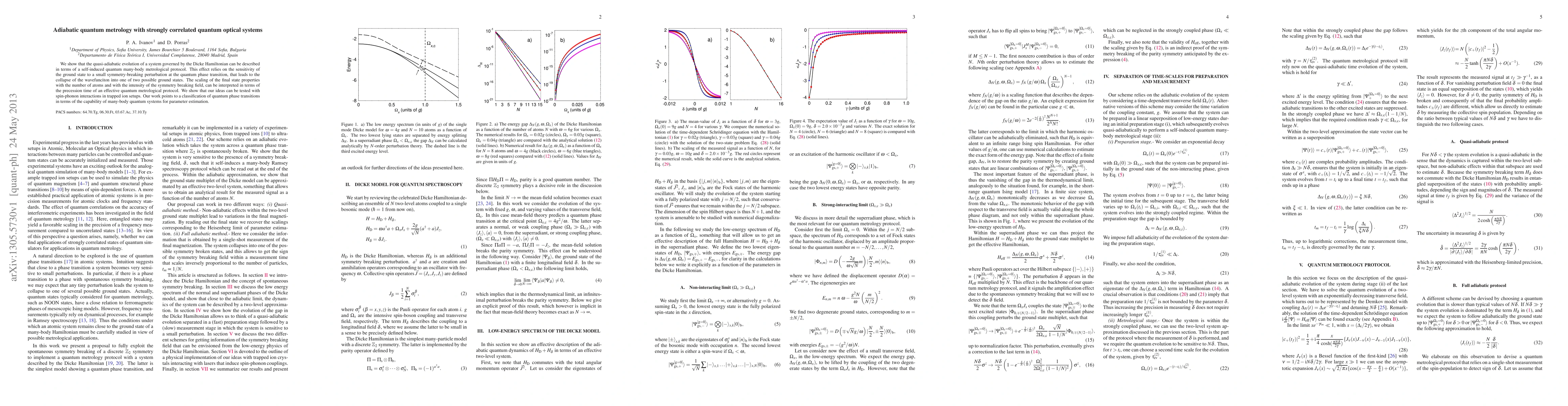 We show that the quasi-adiabatic evolution of a system governed by the Dicke Hamiltonian can be described in terms of a self-induced quantum many-body metrological protocol. This effect relies on the sensitivity of the ground state to a small symmetry-breaking perturbation at the quantum phase transition, that leads to the collapse of the wavefunciton into one of two possible ground states. The scaling of the final state properties with the number of atoms and with the intensity of the symmetry breaking field, can be interpreted in terms of the precession time of an effective quantum metrological protocol. We show that our ideas can be tested with spin-phonon interactions in trapped ion setups. Our work points to a classification of quantum phase transitions in terms of the capability of many-body quantum systems for parameter estimation.