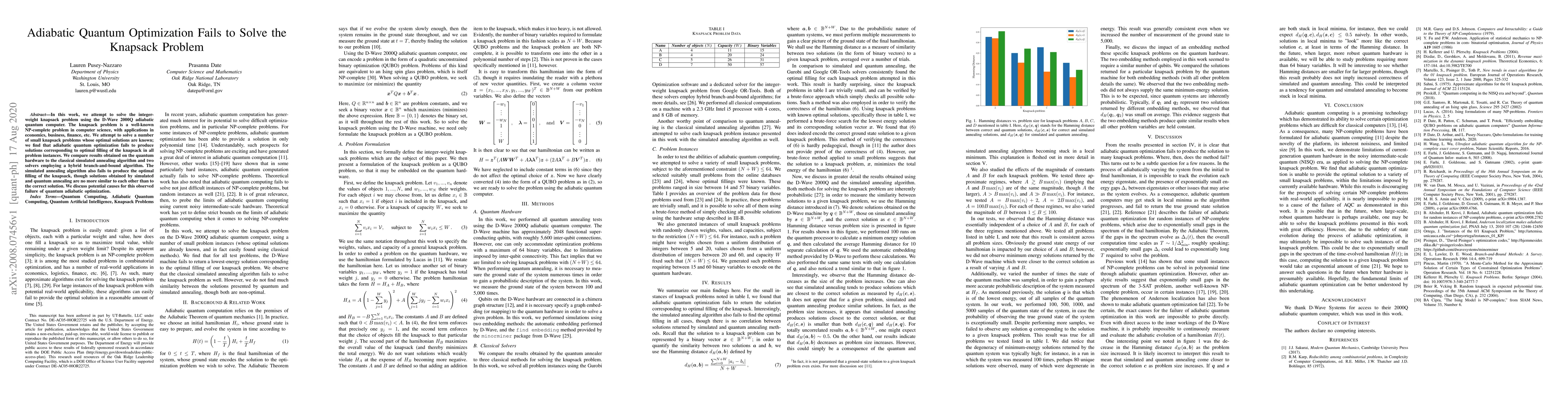 This paper investigates the application of adiabatic quantum optimization using the D-Wave 2000Q to solve small instances of the knapsack problem, finding it fails to produce optimal solutions. Comparisons with classical simulated annealing and hybrid solvers reveal similar suboptimal performance, highlighting challenges in quantum optimization for this NP-complete problem.
