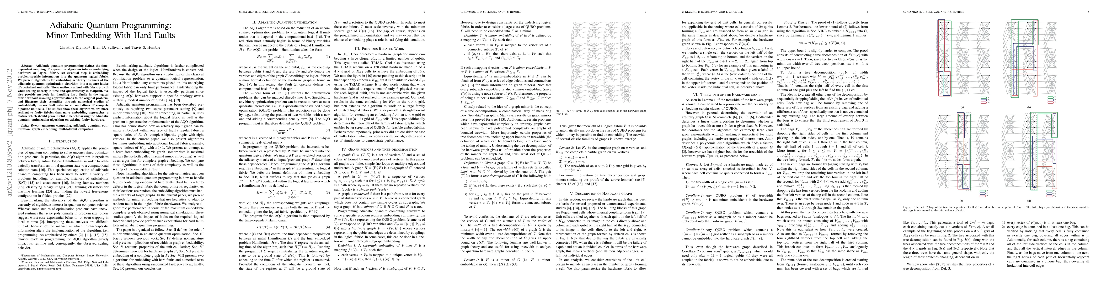 This paper presents algorithms for embedding adiabatic quantum optimization problems onto a square lattice of unit cells, scaling linearly with time and quadratically with footprint. It also introduces methods for managing hard faults in the fabric without compromising the original problem, demonstrating greater resilience to faults compared to naive approaches.