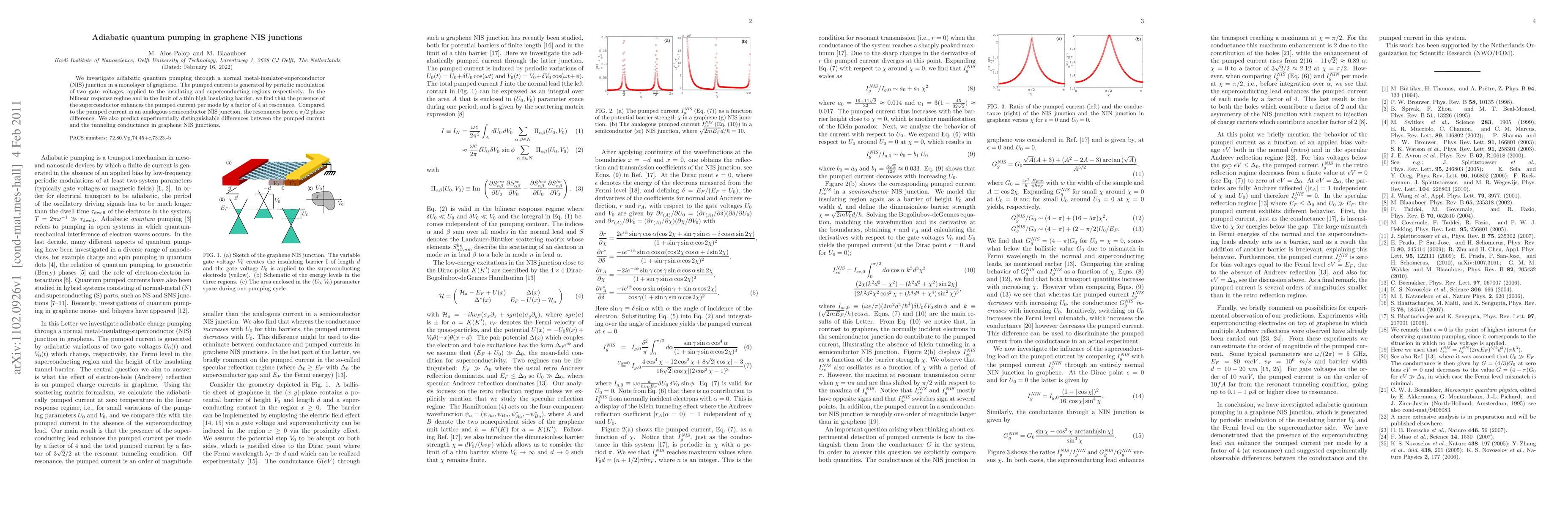 This paper explores adiabatic quantum pumping in graphene NIS junctions, revealing that superconducting regions enhance the pumped current by a factor of 4 at resonance. It also predicts distinct differences between the pumped current and tunneling conductance in graphene compared to semiconductor NIS junctions.
