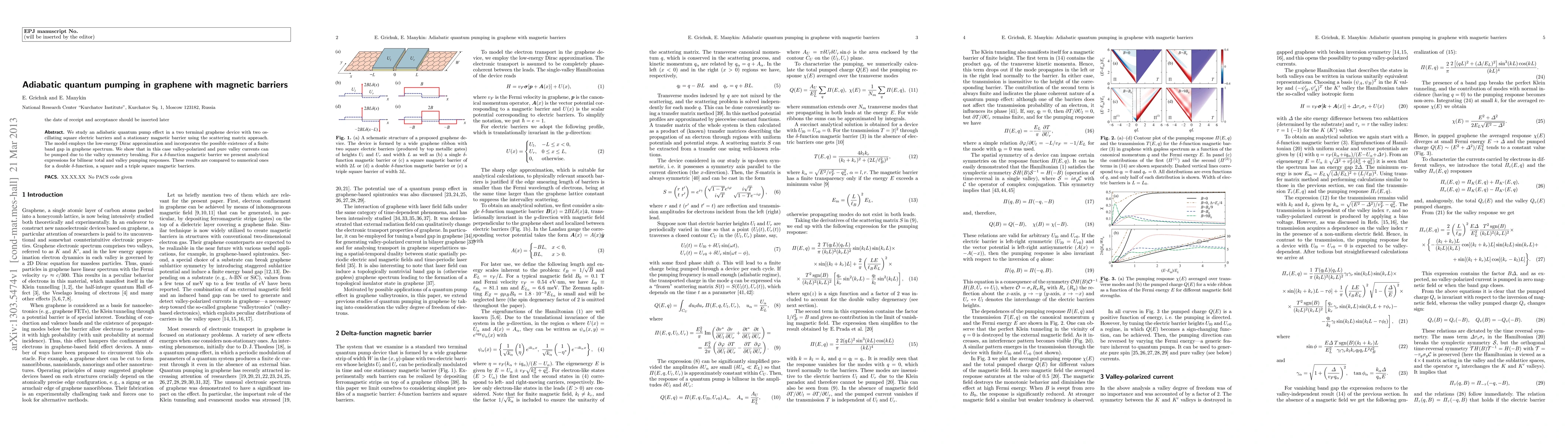 Summary: The research explores adiabatic quantum pumping in graphene using oscillating and stationary barriers, showing valley-polarized and pure valley currents can be induced due to valley symmetry breaking. Analytical and numerical analyses compare different magnetic barrier configurations.
