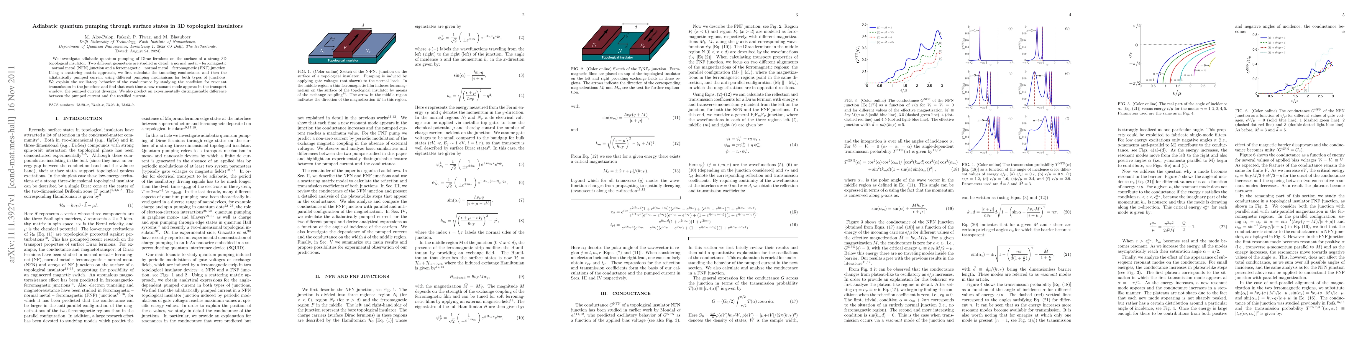 This research explores adiabatic quantum pumping of Dirac fermions on 3D topological insulator surfaces using scattering matrix methods. It examines NFN and FNF junctions, identifying oscillatory conductance due to resonant transmission and predicting distinguishable pumped currents from rectified ones.