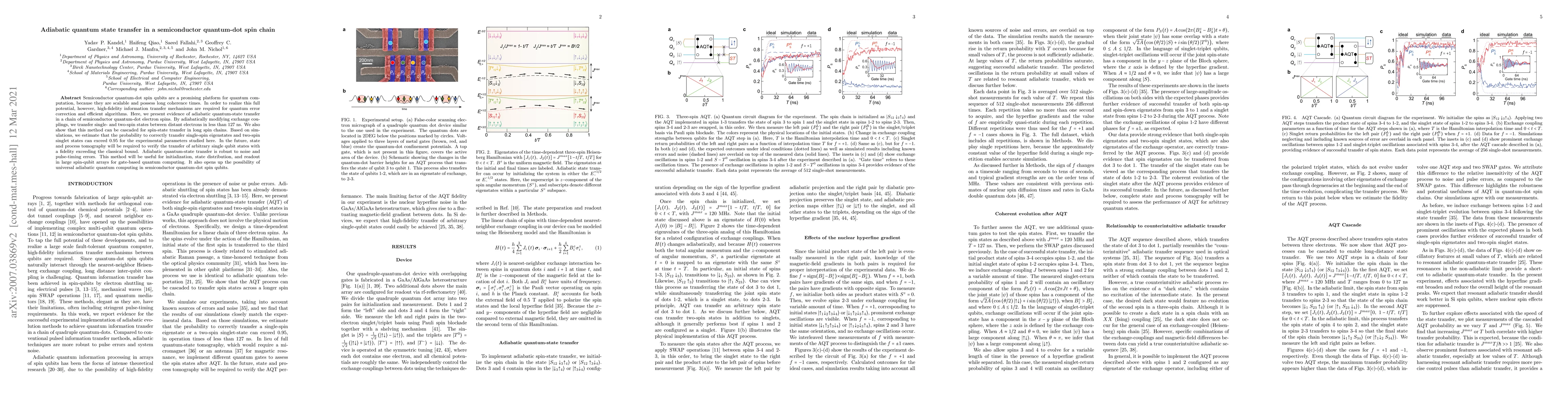 This paper demonstrates adiabatic quantum-state transfer in a semiconductor quantum-dot spin chain, achieving single- and two-spin state transfers in under 127 ns with high fidelity. The method is robust against noise and pulse-timing errors, promising for quantum computing applications.