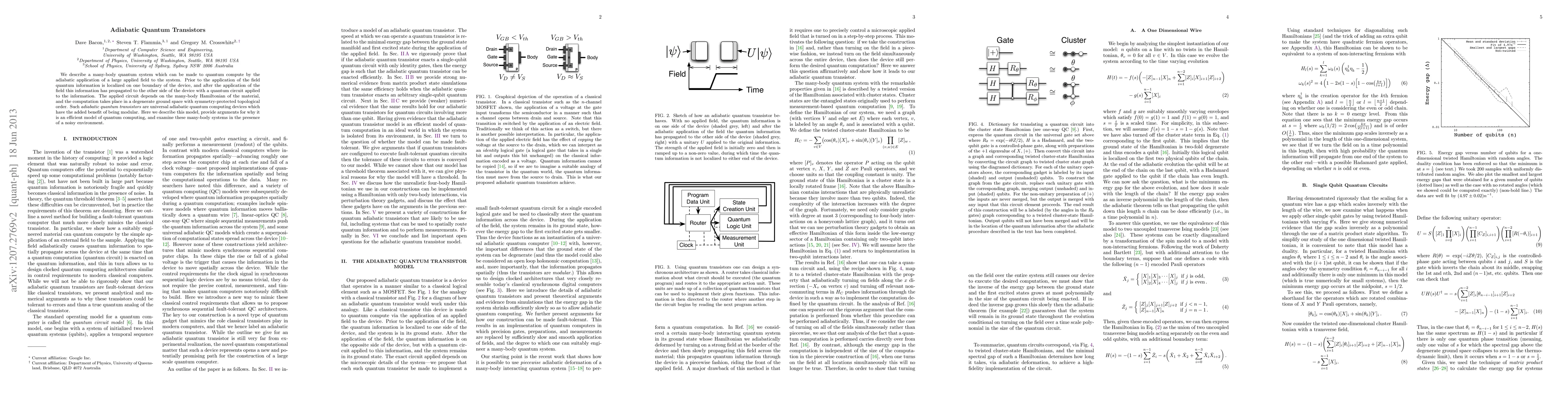 We describe a many-body quantum system which can be made to quantum compute by the adiabatic application of a large applied field to the system. Prior to the application of the field quantum information is localized on one boundary of the device, and after the application of the field this information has propagated to the other side of the device with a quantum circuit applied to the information. The applied circuit depends on the many-body Hamiltonian of the material, and the computation takes place in a degenerate ground space with symmetry-protected topological order. Such adiabatic quantum transistors are universal adiabatic quantum computing devices which have the added benefit of being modular. Here we describe this model, provide arguments for why it is an efficient model of quantum computing, and examine these many-body systems in the presence of a noisy environment.