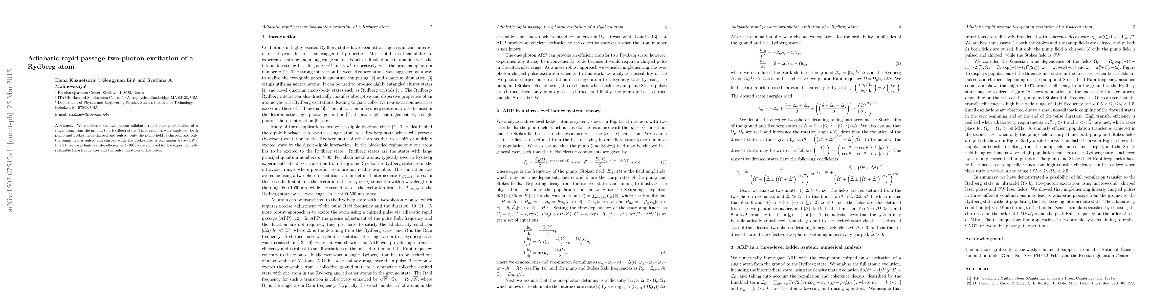 We considered the two-photon adiabatic rapid passage excitation of a single atom from the ground to a Rydberg state. Three schemes were analyzed: both pump and Stokes fields chirped and pulsed, only the pump field is chirped, and only the pump field is pulsed and chirped while the Stokes field is continuous wave (CW). In all three cases high transfer efficiencies $>99\%$ were achieved for the experimentally realizable Rabi frequencies and the pulse durations of the fields.