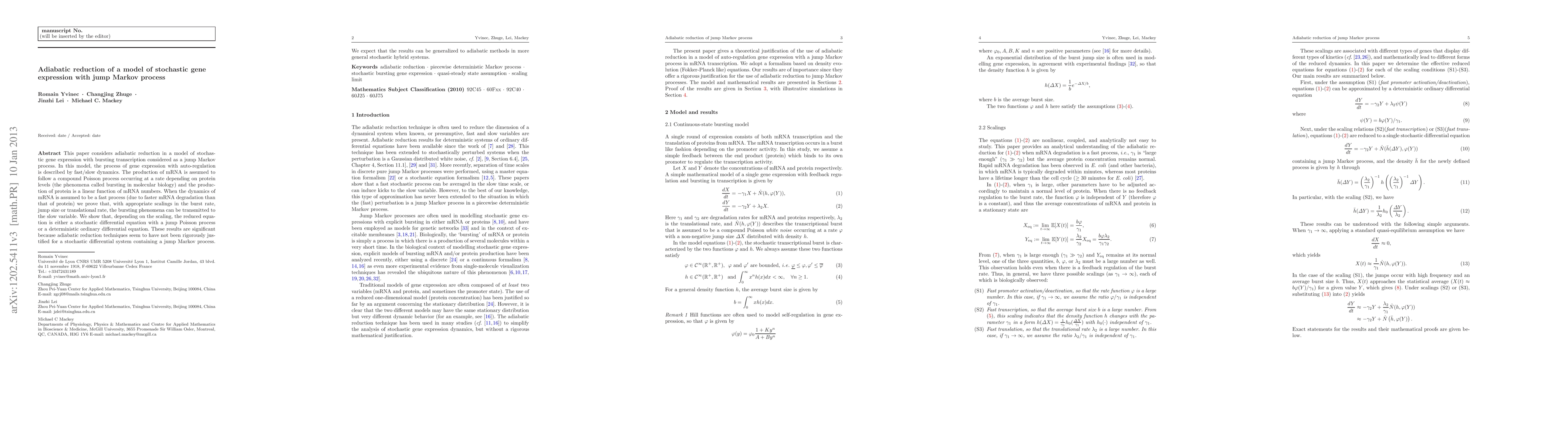 This paper considers adiabatic reduction in a model of stochastic gene expression with bursting transcription considered as a jump Markov process. In this model, the process of gene expression with auto-regulation is described by fast/slow dynamics. The production of mRNA is assumed to follow a compound Poisson process occurring at a rate depending on protein levels (the phenomena called bursting in molecular biology) and the production of protein is a linear function of mRNA numbers. When the dynamics of mRNA is assumed to be a fast process (due to faster mRNA degradation than that of protein) we prove that, with appropriate scalings in the burst rate, jump size or translational rate, the bursting phenomena can be transmitted to the slow variable. We show that, depending on the scaling, the reduced equation is either a stochastic differential equation with a jump Poisson process or a deterministic ordinary differential equation. These results are significant because adiabatic reduction techniques seem to have not been rigorously justified for a stochastic differential system containing a jump Markov process. We expect that the results can be generalized to adiabatic methods in more general stochastic hybrid systems.