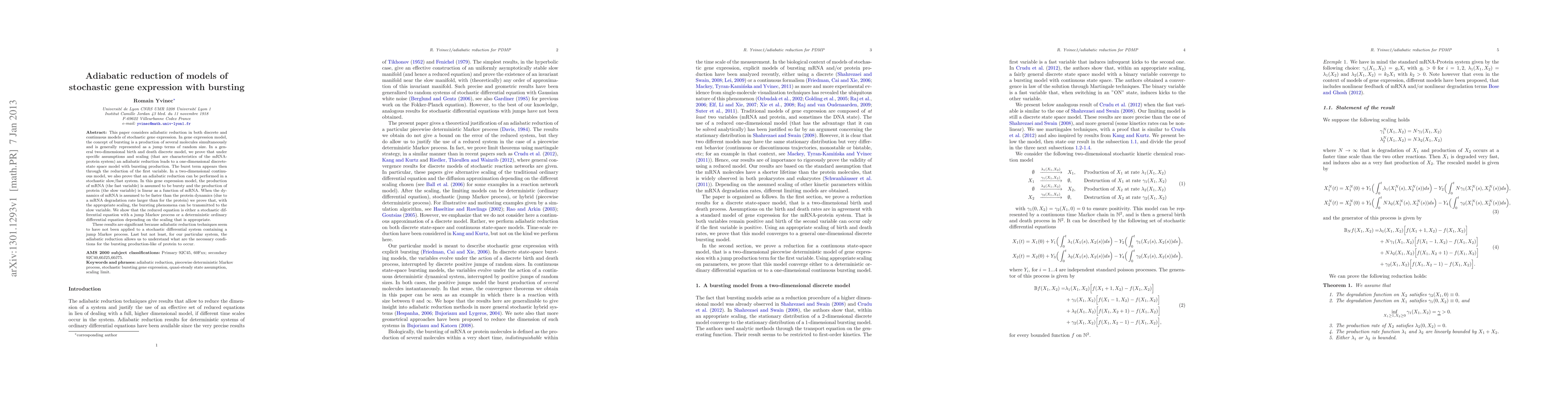 This paper explores adiabatic reduction techniques in stochastic gene expression models, particularly focusing on the phenomenon of bursting. It demonstrates how adiabatic reduction can simplify complex models into more manageable forms, revealing conditions under which bursting in protein production emerges.