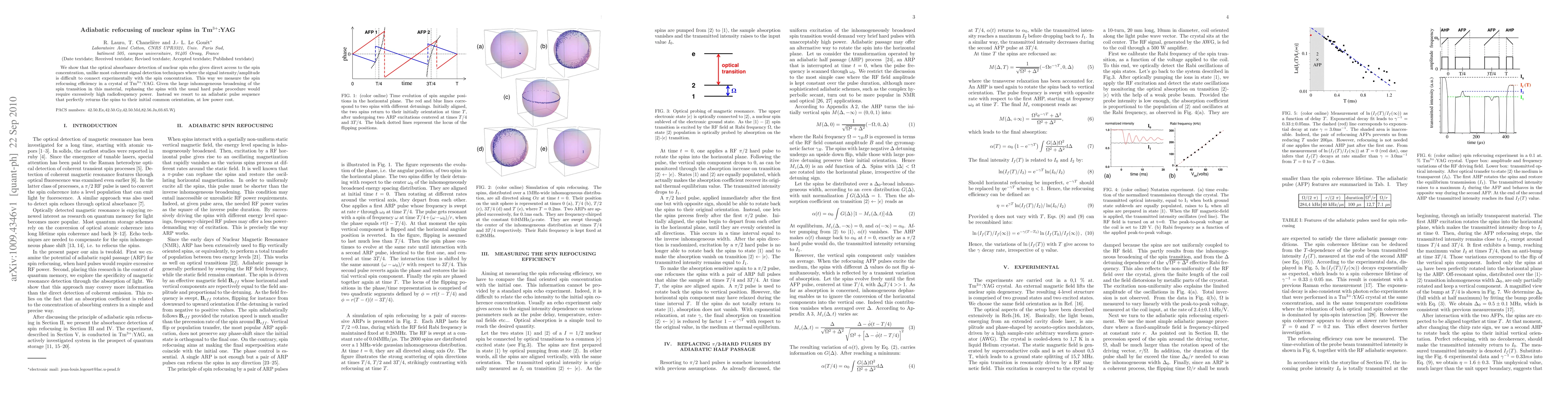 The paper presents a method using adiabatic refocusing to efficiently rephase nuclear spins in Tm3+:YAG, overcoming high power requirements of traditional techniques. This approach directly links optical absorbance detection to spin concentration, offering a low-power solution for materials with large inhomogeneous broadening.