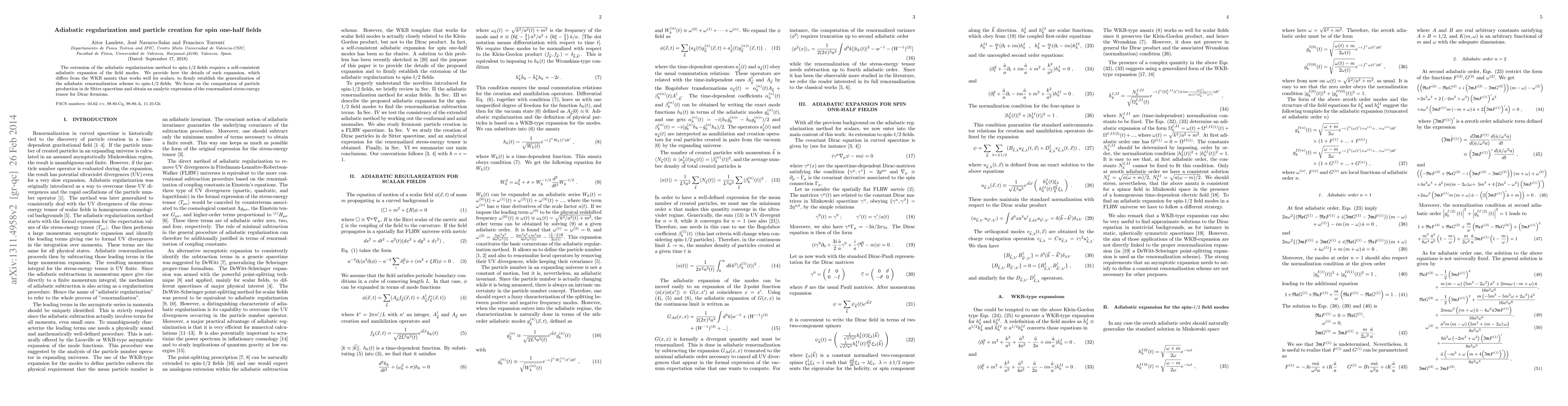 This paper extends the adiabatic regularization method to spin-$1/2$ fields, providing a self-consistent adiabatic expansion of field modes distinct from the WKB ansatz for scalars. It computes particle production in de Sitter spacetime and derives an analytic expression for the renormalized stress-energy tensor of Dirac fermions.