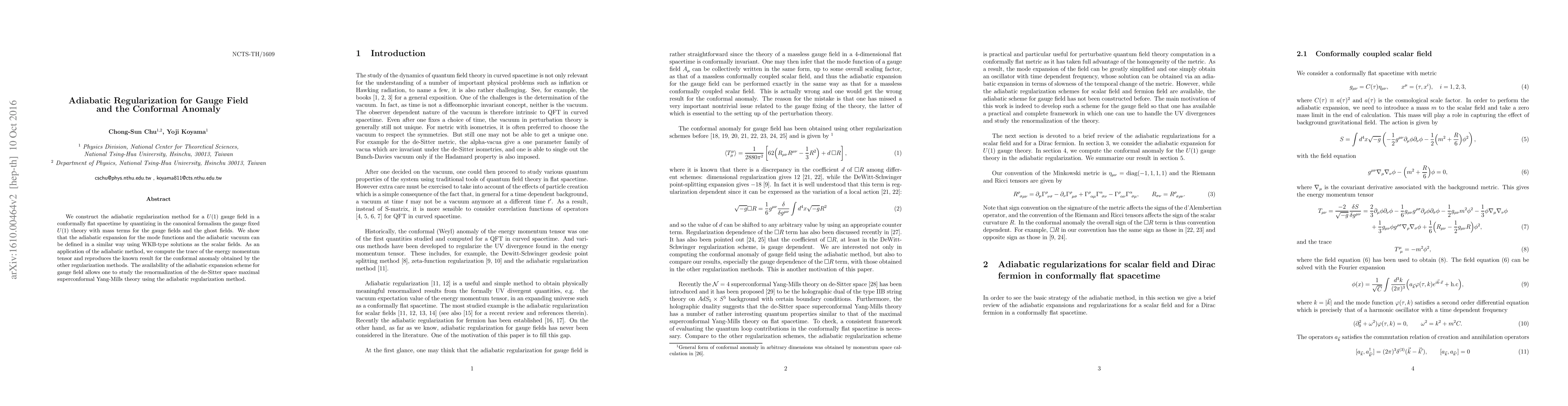 This paper develops an adiabatic regularization method for a $U(1)$ gauge field in conformally flat spacetime, showing it can define adiabatic expansions and reproduce the conformal anomaly. The method enables the study of renormalization in de-Sitter space maximal superconformal Yang-Mills theory.