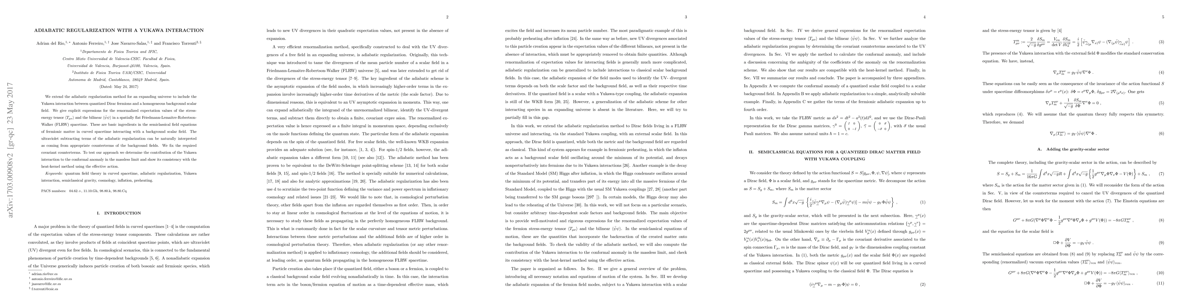 This paper extends the adiabatic regularization method to include the Yukawa interaction in an expanding universe, providing explicit expressions for renormalized stress-energy tensors and bilinears. It interprets the regularization terms as covariant counterterms and tests their consistency by examining the Yukawa interaction's contribution to the conformal anomaly.
