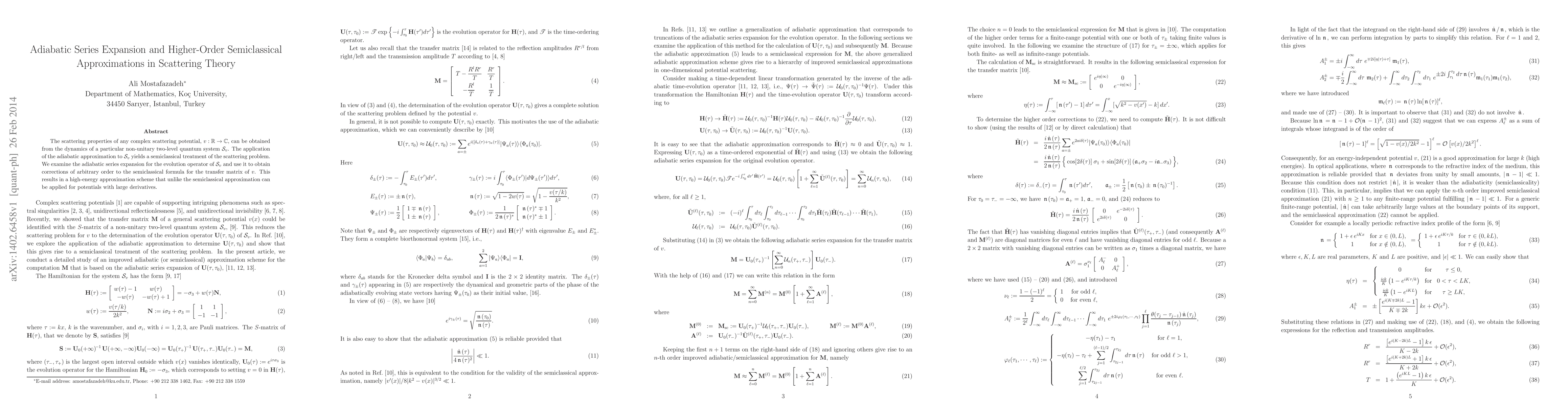 The scattering properties of any complex scattering potential, v:R -> C, can be obtained from the dynamics of a particular non-unitary two-level quantum system S_v. The application of the adiabatic approximation to S_v yields a semiclassical treatment of the scattering problem. We examine the adiabatic series expansion for the evolution operator of S_v and use it to obtain corrections of arbitrary order to the semiclassical formula for the transfer matrix of v. This results in a high-energy approximation scheme that unlike the semiclassical approximation can be applied for potentials with large derivatives.