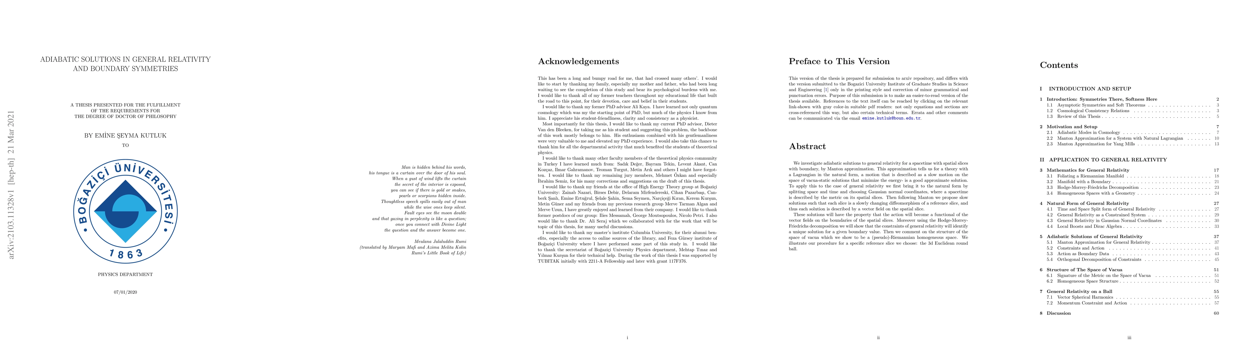 We investigate adiabatic solutions to general relativity for a spacetime with spatial slices with boundary, by Manton approximation. This approximation tells us for a theory with a Lagrangian in the natural form, a motion that is described as a slow motion on the space of vacua-static solutions that minimize the energy -- is a good approximate solution. To apply this to the case of general relativity we first bring it to the natural form by splitting space and time and choosing Gaussian normal coordinates, where a spacetime is described by the metric on its spatial slices. Then following Manton we propose slow solutions such that each slice is a slowly changing diffeomorphism of a reference slice, and thus each solution is described by a vector field on the spatial slice. These solutions will have the property that the action will become a functional of the vector fields on the boundaries of the spatial slices. Moreover using the Hodge-Morrey-Friedrichs decomposition we will show that the constraints of general relativity will identify a unique solution for a given boundary value. Then we comment on the structure of the space of vacua which we show to be a (pseudo)-Riemannian homogeneous space. We illustrate our procedure for a specific reference slice we choose: the 3d Euclidean round ball.