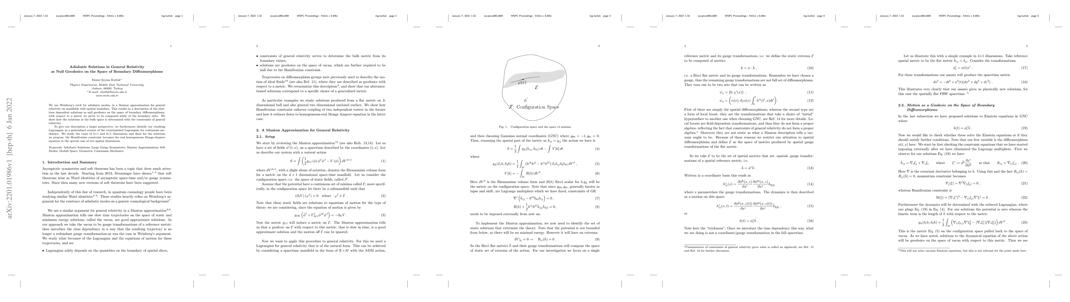 This paper proposes a method to describe adiabatic solutions in general relativity as null geodesics on the space of boundary diffeomorphisms, using a Manton approximation. It identifies the Lagrangian as a generalized covariantized version for continuum mechanics, and demonstrates the Hamiltonian constraint as the real homogeneous Monge-Ampere equation in 2+1 dimensions.