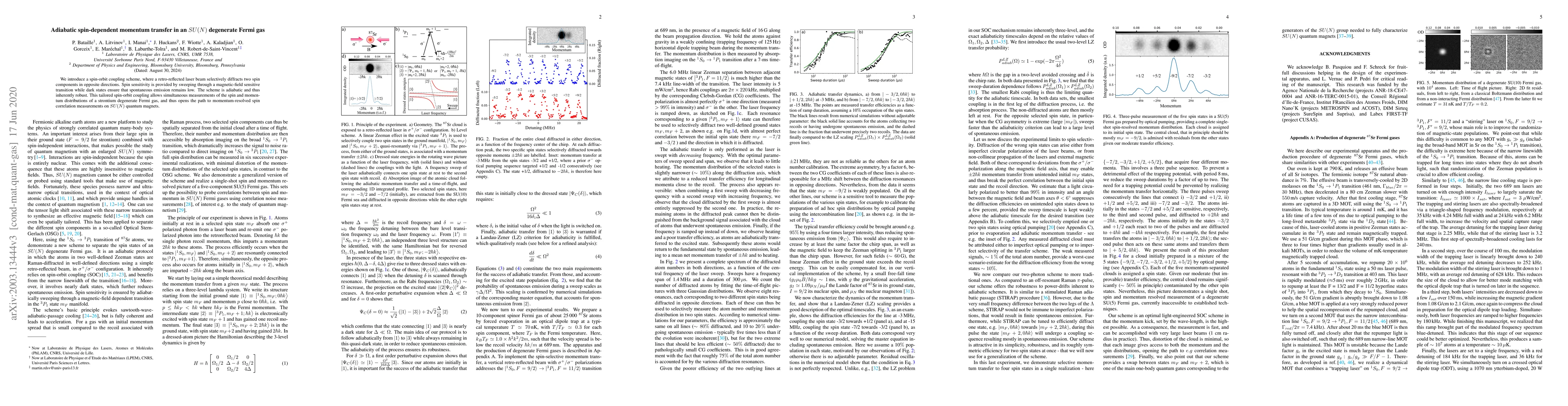 This paper proposes an adiabatic spin-orbit coupling method using a retro-reflected laser beam to selectively diffract spin components, enabling robust measurements of spin and momentum distributions in a strontium degenerate Fermi gas. This technique paves the way for momentum-resolved spin correlation studies in SU(N) quantum magnets.