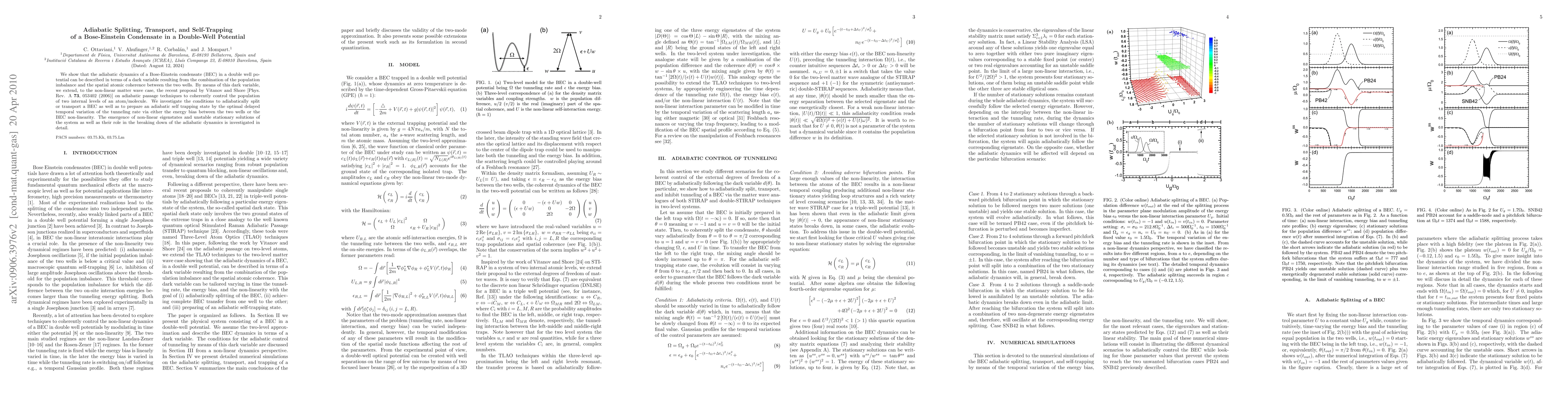 This paper explores the adiabatic dynamics of a Bose-Einstein condensate in a double-well potential, describing it through a dark variable that combines population imbalance and spatial coherence. The study extends adiabatic passage techniques to control the BEC's population and investigates conditions for adiabatic splitting, transport, and self-trapping, highlighting the role of non-linear eigenstates and unstable solutions.