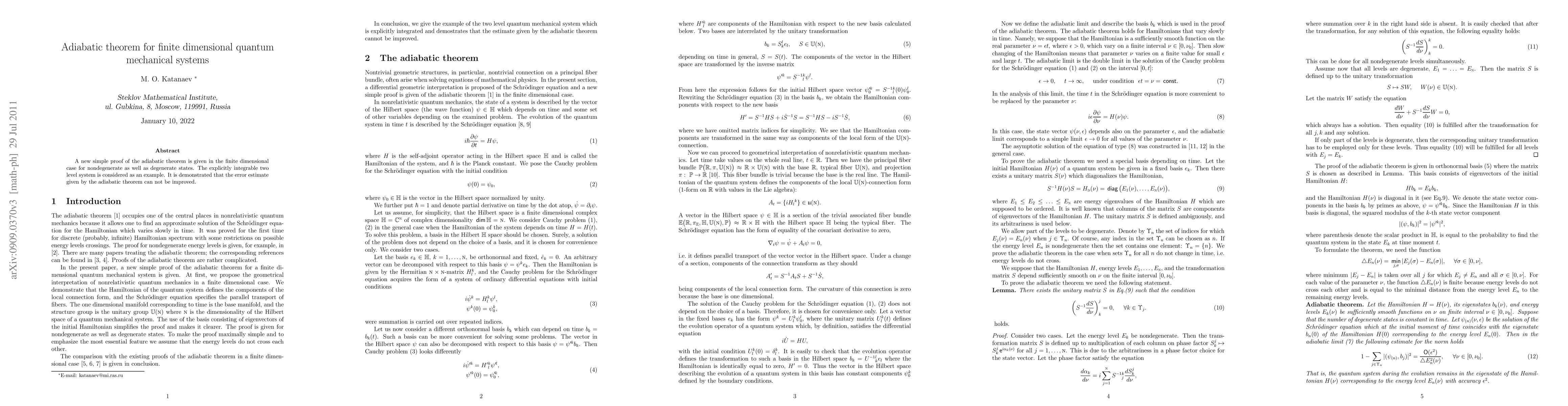 The paper introduces a clearer proof of the adiabatic theorem for finite dimensional quantum systems, utilizing a basis of eigenvectors of the initial Hamiltonian.