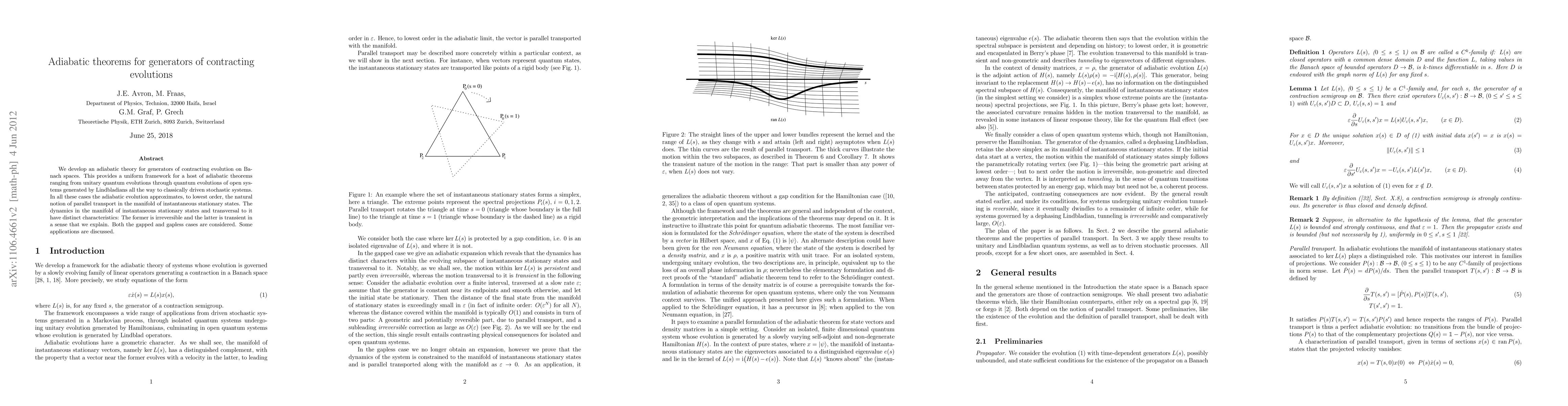 We develop an adiabatic theory for generators of contracting evolution on Banach spaces. This provides a uniform framework for a host of adiabatic theorems ranging from unitary quantum evolutions through quantum evolutions of open systems generated by Lindbladians all the way to classically driven stochastic systems. In all these cases the adiabatic evolution approximates, to lowest order, the natural notion of parallel transport in the manifold of instantaneous stationary states. The dynamics in the manifold of instantaneous stationary states and transversal to it have distinct characteristics: The former is irreversible and the latter is transient in a sense that we explain. Both the gapped and gapless cases are considered. Some applications are discussed.