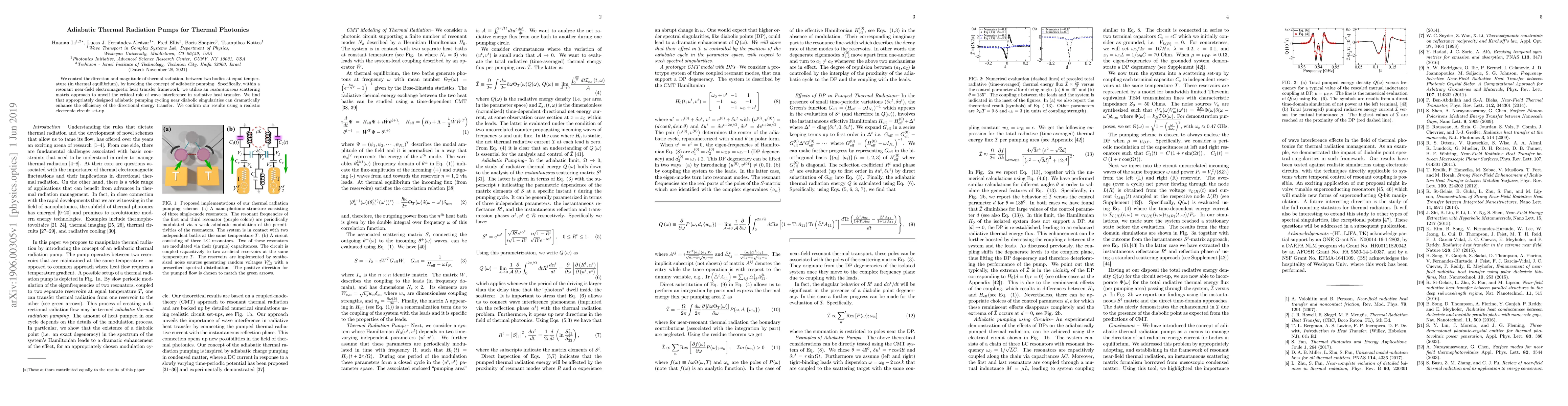 We control the direction and magnitude of thermal radiation, between two bodies at equal temperature (in thermal equilibrium), by invoking the concept of adiabatic pumping. Specifically, within a resonant near-field electromagnetic heat transfer framework, we utilize an {\it instantaneous} scattering matrix approach to unveil the critical role of wave interference in radiative heat transfer. We find that appropriately designed adiabatic pumping cycling near diabolic singularities can dramatically enhance the efficiency of the directional energy transfer. We confirm our results using a realistic electronic circuit set-up.