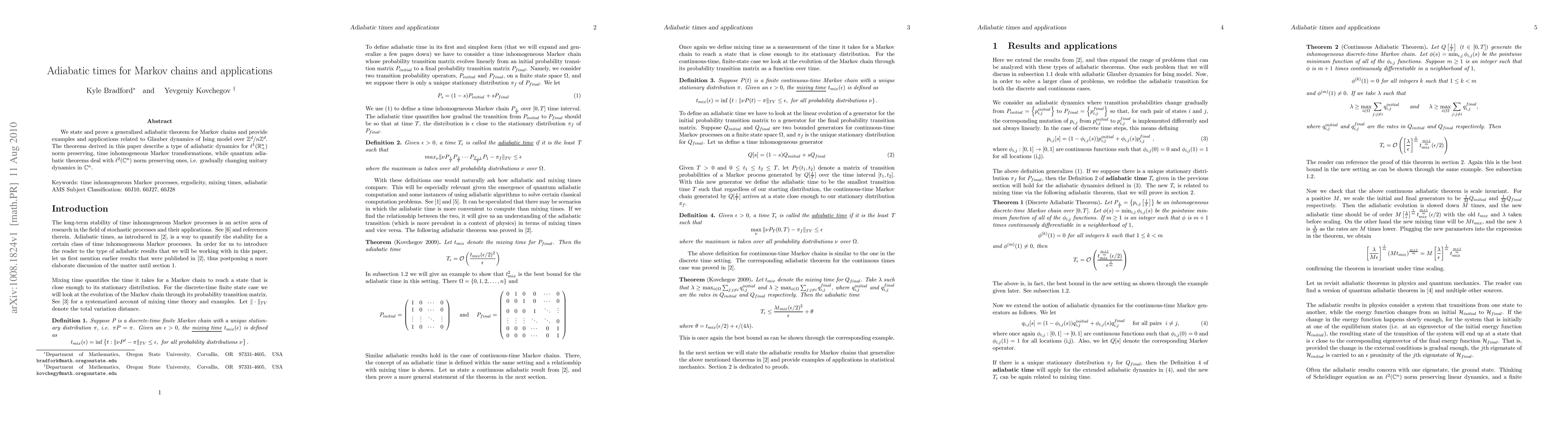 The paper presents a novel adiabatic theorem for Markov chains, extending the concept from quantum mechanics to stochastic processes, and provides explicit adiabatic time scales for certain models.