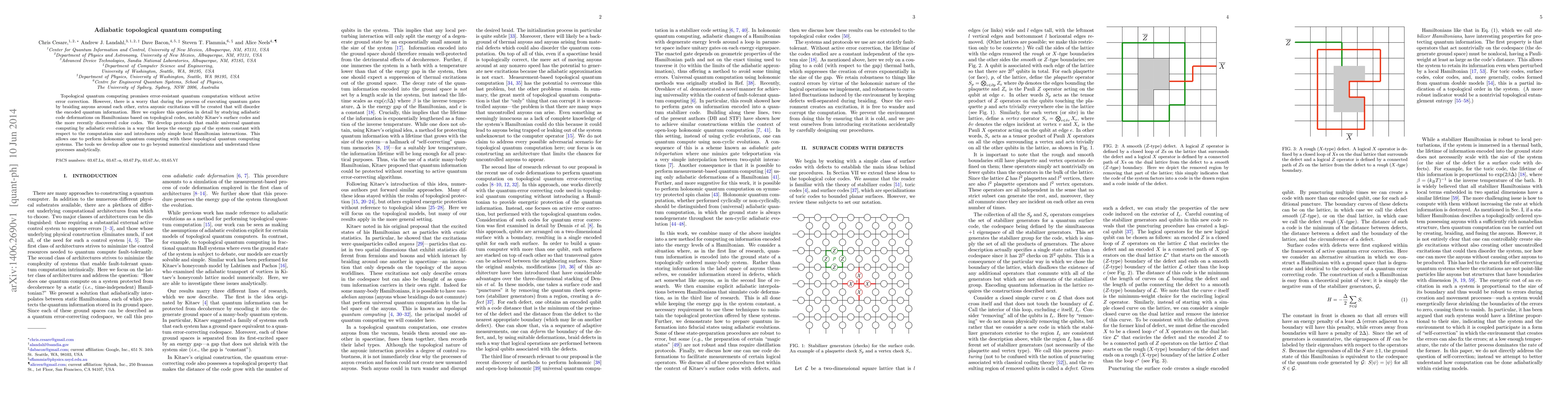 This paper develops protocols for adiabatic topological quantum computing using Kitaev's surface codes and color codes, ensuring constant energy gaps and minimal local interactions to maintain error-resistant quantum computation without active error correction. Analytical tools are introduced to understand these processes beyond numerical simulations.