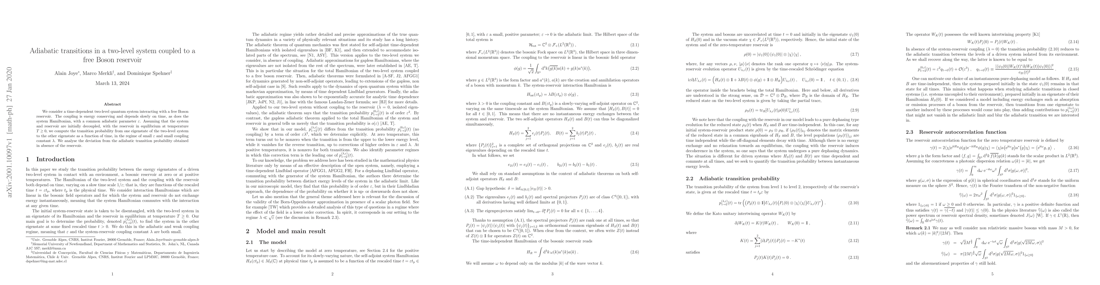 We consider a time-dependent two-level quantum system interacting with a free Boson reservoir. The coupling is energy conserving and depends slowly on time, as does the system Hamiltonian, with a common adiabatic parameter $\varepsilon$. Assuming that the system and reservoir are initially decoupled, with the reservoir in equilibrium at temperature $T\ge 0$, we compute the transition probability from one eigenstate of the two-level system to the other eigenstate as a function of time, in the regime of small $\varepsilon$ and small coupling constant $\lambda$. We analyse the deviation from the adiabatic transition probability obtained in absence of the reservoir.