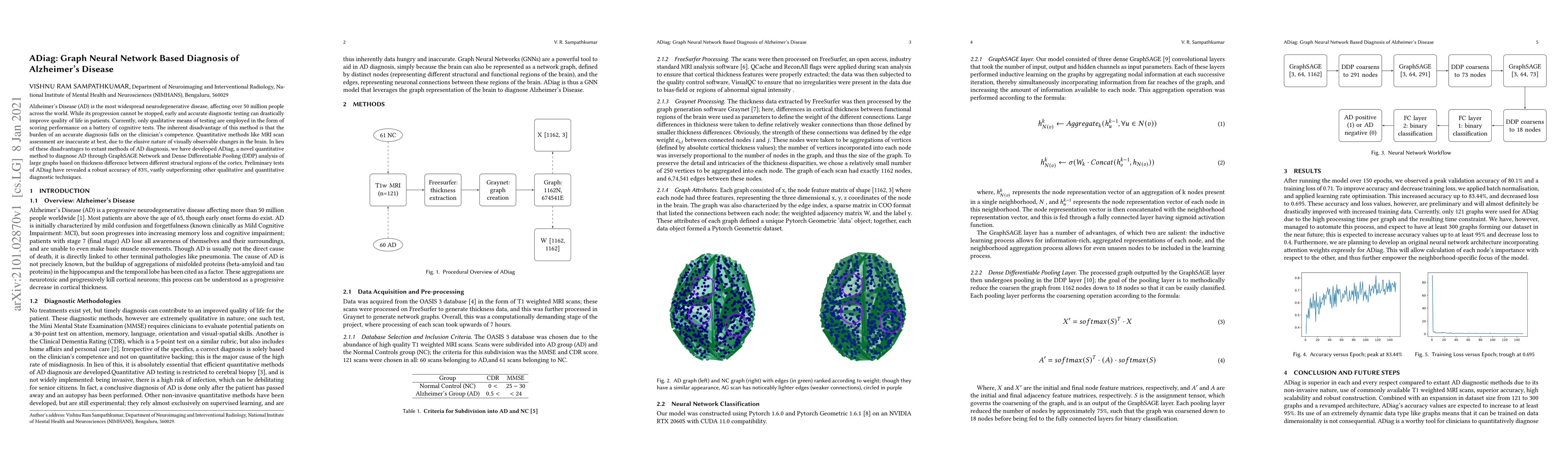 Alzheimer's Disease (AD) is the most widespread neurodegenerative disease, affecting over 50 million people across the world. While its progression cannot be stopped, early and accurate diagnostic testing can drastically improve quality of life in patients. Currently, only qualitative means of testing are employed in the form of scoring performance on a battery of cognitive tests. The inherent disadvantage of this method is that the burden of an accurate diagnosis falls on the clinician's competence. Quantitative methods like MRI scan assessment are inaccurate at best,due to the elusive nature of visually observable changes in the brain. In lieu of these disadvantages to extant methods of AD diagnosis, we have developed ADiag, a novel quantitative method to diagnose AD through GraphSAGE Network and Dense Differentiable Pooling (DDP) analysis of large graphs based on thickness difference between different structural regions of the cortex. Preliminary tests of ADiag have revealed a robust accuracy of 83%, vastly outperforming other qualitative and quantitative diagnostic techniques.