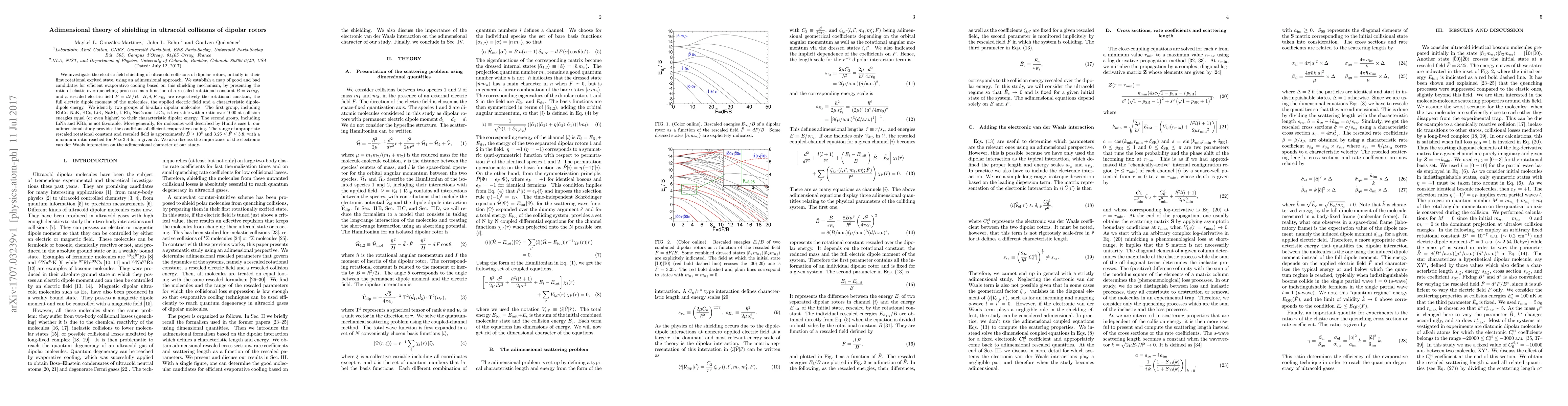 This paper explores the electric field shielding in ultracold collisions of dipolar rotors using an adimensional approach, identifying favorable bi-alkali molecules for evaporative cooling based on the ratio of elastic to quenching processes. It finds that molecules like RbCs and NaK exhibit favorable conditions for cooling, while LiNa and KRb do not, with optimal conditions occurring at $\tilde{B} \ge 10^8$ and $3.25 \le \tilde{F} \le 3.8$.