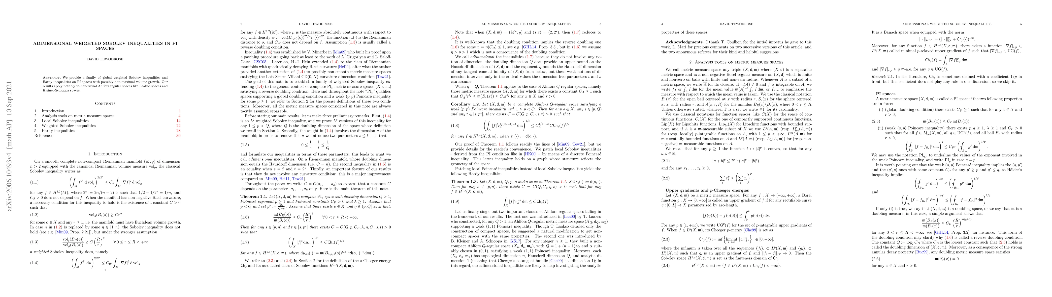 We provide a family of global weighted Sobolev inequalities and Hardy inequalities on PI spaces with possibly non-maximal volume growth. Our results apply notably to non-trivial Ahlfors regular spaces like Laakso spaces and Kleiner-Schioppa spaces.