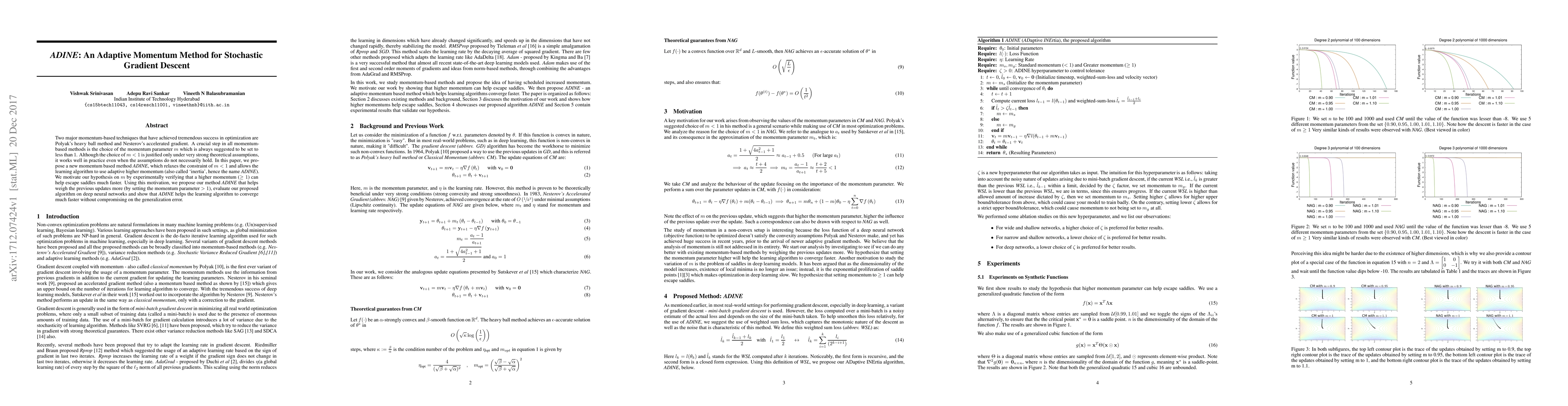 Two major momentum-based techniques that have achieved tremendous success in optimization are Polyak's heavy ball method and Nesterov's accelerated gradient. A crucial step in all momentum-based methods is the choice of the momentum parameter $m$ which is always suggested to be set to less than $1$. Although the choice of $m < 1$ is justified only under very strong theoretical assumptions, it works well in practice even when the assumptions do not necessarily hold. In this paper, we propose a new momentum based method $\textit{ADINE}$, which relaxes the constraint of $m < 1$ and allows the learning algorithm to use adaptive higher momentum. We motivate our hypothesis on $m$ by experimentally verifying that a higher momentum ($\ge 1$) can help escape saddles much faster. Using this motivation, we propose our method $\textit{ADINE}$ that helps weigh the previous updates more (by setting the momentum parameter $> 1$), evaluate our proposed algorithm on deep neural networks and show that $\textit{ADINE}$ helps the learning algorithm to converge much faster without compromising on the generalization error.