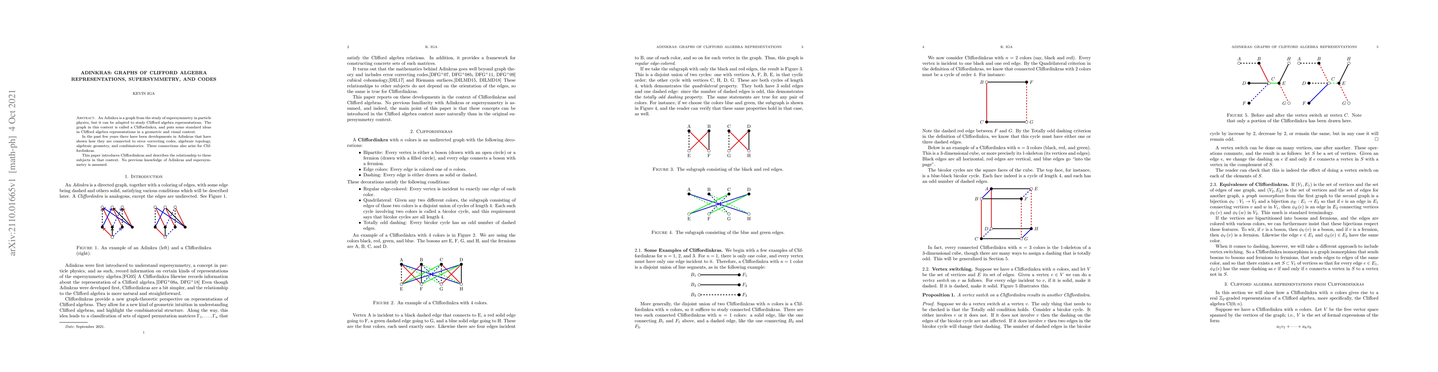This paper introduces Cliffordinkras, a visual representation of Clifford algebra, linking supersymmetry concepts to geometry. It explores their connections to error correcting codes, topology, geometry, and combinatorics, offering a new perspective without requiring prior knowledge of Adinkras or supersymmetry.