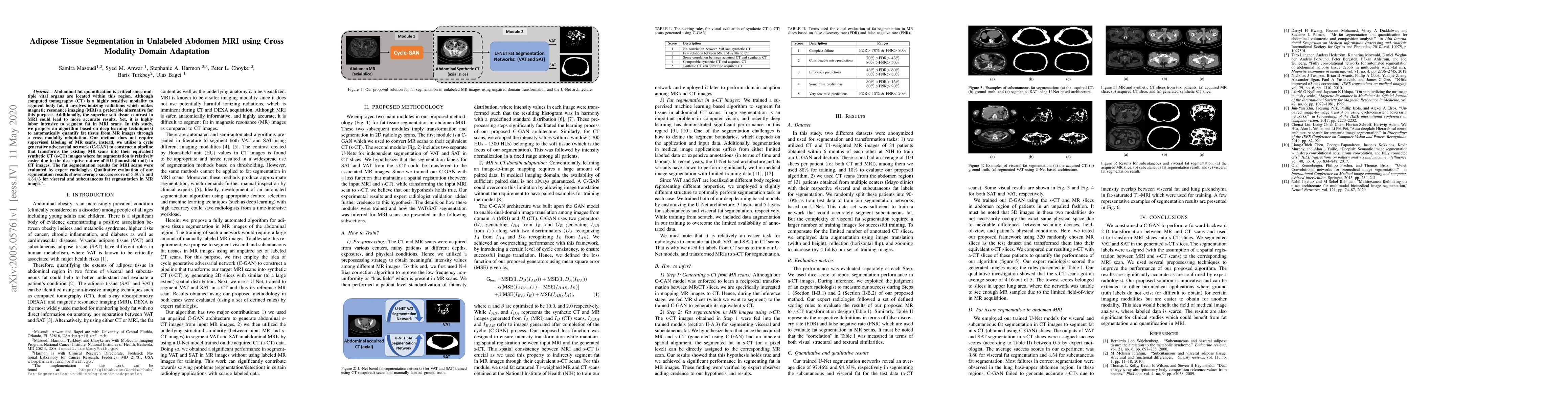 This paper proposes a deep learning-based algorithm to automatically segment adipose tissue in unlabeled abdomen MRI scans using cross modality domain adaptation. The method employs a cycle generative adversarial network to transform MRI scans into synthetic CT images, facilitating easier fat segmentation, and achieves a success score of 3.80/5 and 4.54/5 for visceral and subcutaneous fat segmentation, respectively.