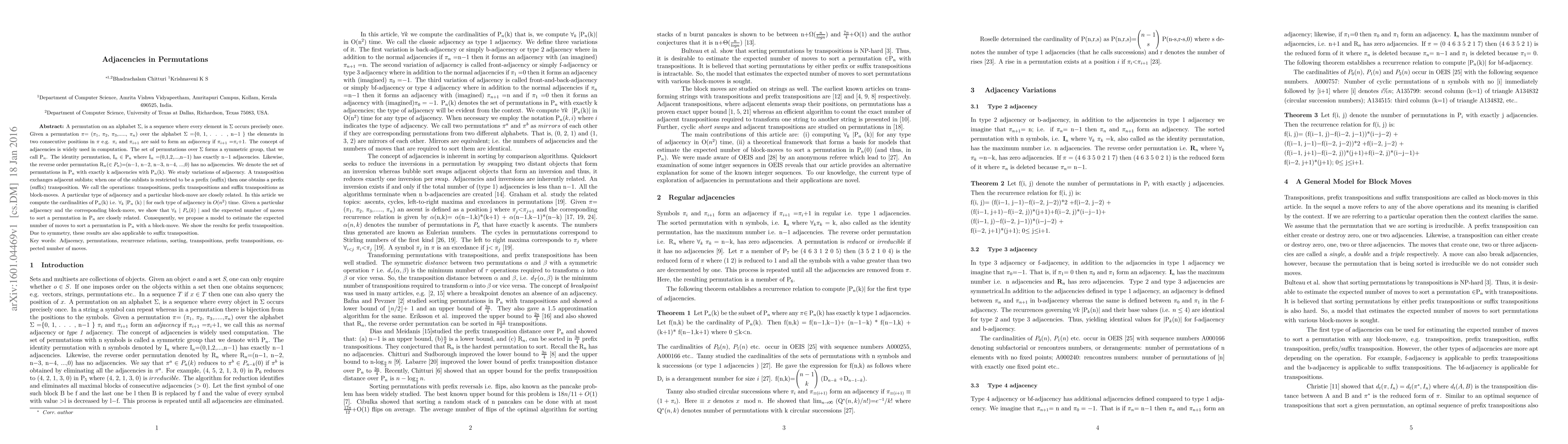 A permutation on an alphabet $ \Sigma $, is a sequence where every element in $ \Sigma $ occurs precisely once. Given a permutation $ \pi $= ($\pi_{1} $, $ \pi_{2} $, $ \pi_{3} $,....., $ \pi_{n} $) over the alphabet $ \Sigma $ =$\{ $0, 1, . . . , n$-$1 $\}$ the elements in two consecutive positions in $ \pi $ e.g. $ \pi_{i} $ and $ \pi_{i+1} $ are said to form an \emph{adjacency} if $ \pi_{i+1} $ =$ \pi_{i} $+1. The concept of adjacencies is widely used in computation. The set of permutations over $ \Sigma $ forms a symmetric group, that we call P$ _{n} $. The identity permutation, I$ _{n}$ $\in$ P$_{n}$ where I$_{n}$ =(0,1,2,...,n$-$1) has exactly n$ - $1 adjacencies. Likewise, the reverse order permutation R$_{n} (\in P_{n})$=(n$-$1, n$-$2, n$-$3, n$-$4, ...,0) has no adjacencies. We denote the set of permutations in P$_{n} $ with exactly k adjacencies with P$_{n} $(k). We study variations of adjacency. % A transposition exchanges adjacent sublists; when one of the sublists is restricted to be a prefix (suffix) then one obtains a prefix (suffix) transposition. We call the operations: transpositions, prefix transpositions and suffix transpositions as block-moves. A particular type of adjacency and a particular block-move are closely related. In this article we compute the cardinalities of P$_{n}$(k) i.e. $ \forall_k \mid $P$ _{n} $ (k) $ \mid $ for each type of adjacency in $O(n^2)$ time. Given a particular adjacency and the corresponding block-move, we show that $\forall_{k} \mid P_{n}(k)\mid$ and the expected number of moves to sort a permutation in P$_{n} $ are closely related. Consequently, we propose a model to estimate the expected number of moves to sort a permutation in P$_{n} $ with a block-move. We show the results for prefix transposition. Due to symmetry, these results are also applicable to suffix transposition.