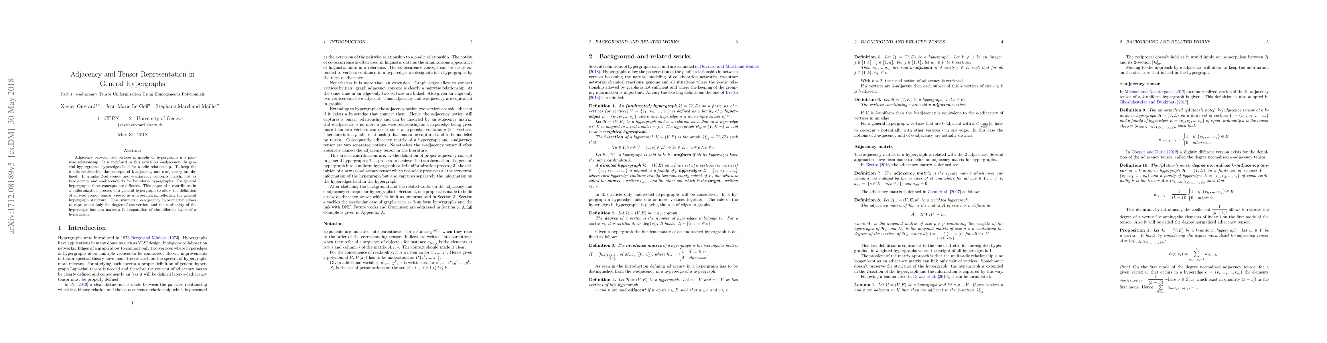 This paper redefines adjacency in general hypergraphs as 2-adjacency and introduces $k$-adjacency and e-adjacency concepts to capture $n$-adic relationships. It proposes a uniformization method to define an e-adjacency tensor, a hypermatrix that reflects the hypergraph structure and separates its different layers.