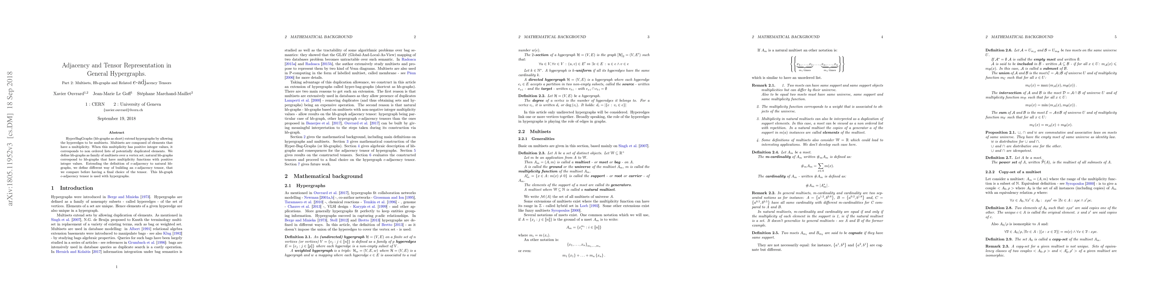 HyperBagGraphs (hb-graphs as short) extend hypergraphs by allowing the hyperedges to be multisets. Multisets are composed of elements that have a multiplicity. When this multiplicity has positive integer values, it corresponds to non ordered lists of potentially duplicated elements. We define hb-graphs as family of multisets over a vertex set; natural hb-graphs correspond to hb-graphs that have multiplicity function with positive integer values. Extending the definition of e-adjacency to natural hb-graphs, we define different way of building an e-adjacency tensor, that we compare before having a final choice of the tensor. This hb-graph e-adjacency tensor is used with hypergraphs.