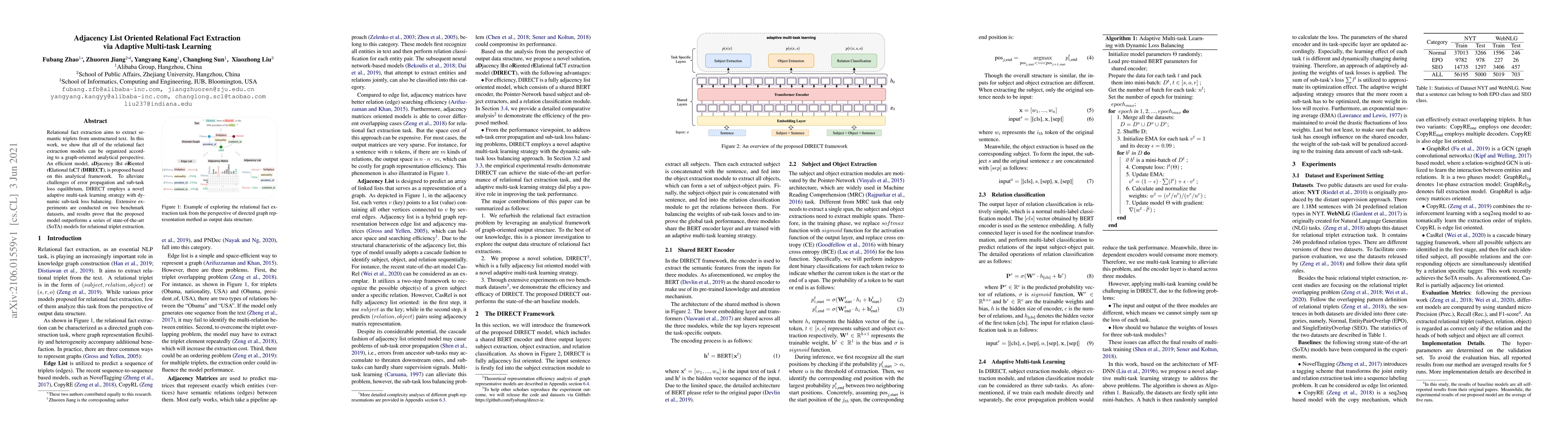 This paper proposes DIRECT, a graph-oriented model for relational fact extraction using adaptive multi-task learning to balance sub-task losses, demonstrating superior performance over state-of-the-art models on benchmark datasets.